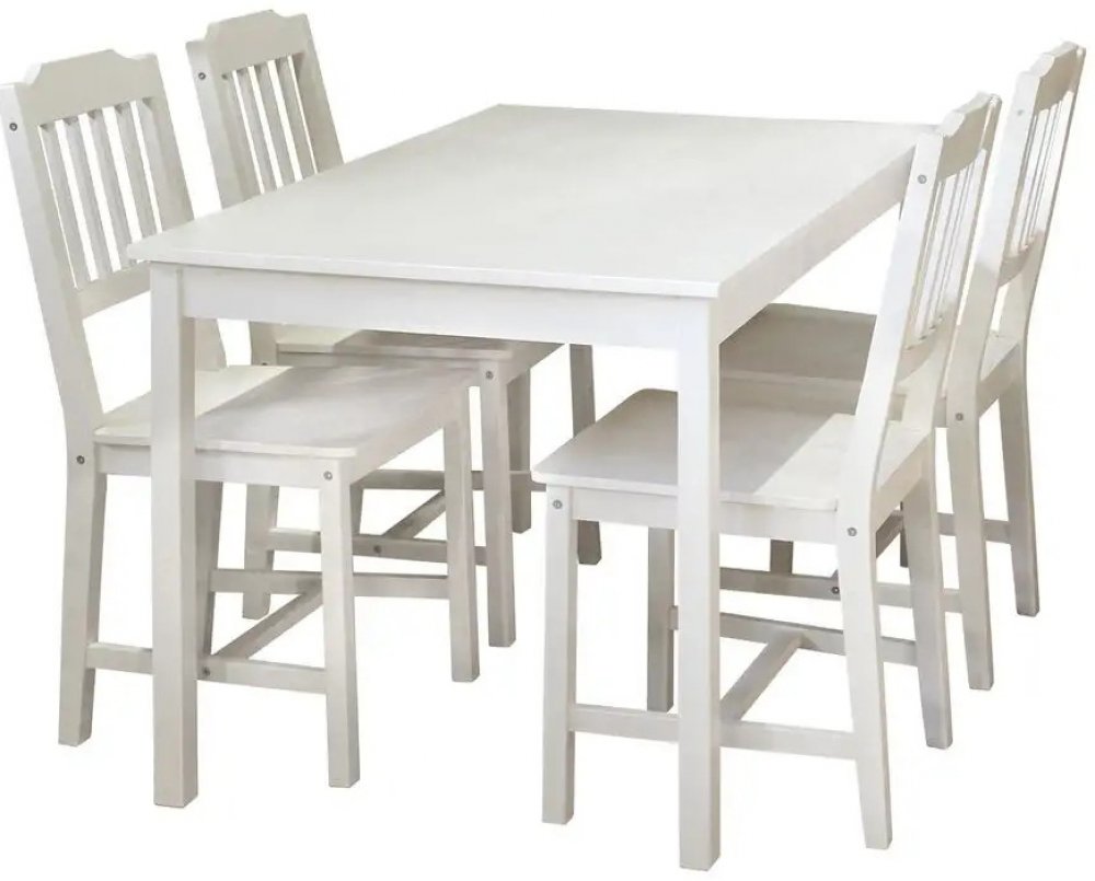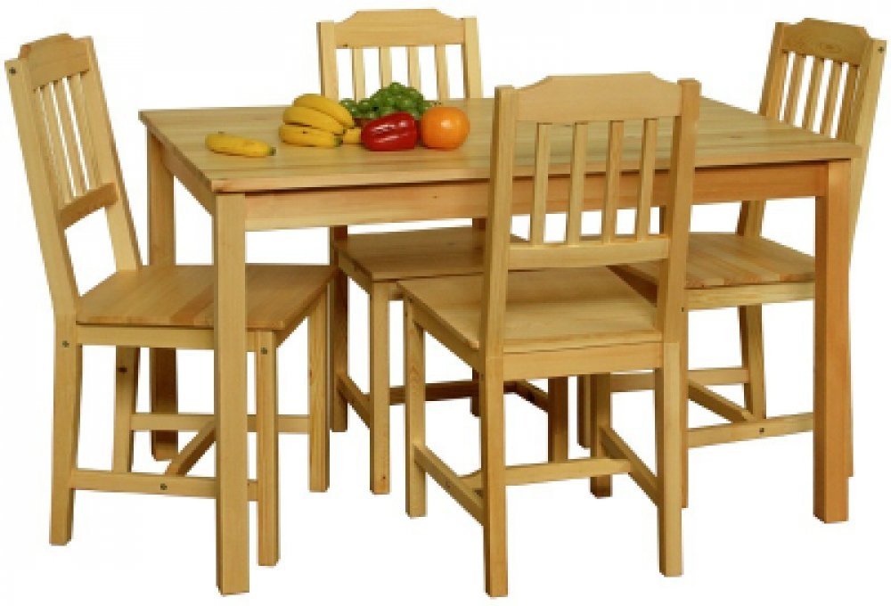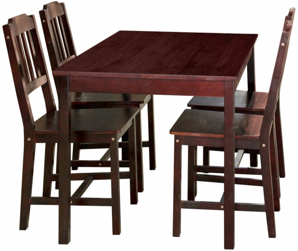 Hnědá jídelní sestava v provedení masiv borovice vytvoří ve vaší jídelně kout vhodný k trávení společného času u dobrého jídla. Robustní stůl a čtyři klasické židle vám nabídnou dokonalé posezení. Výška sedu židle je 45 cm.