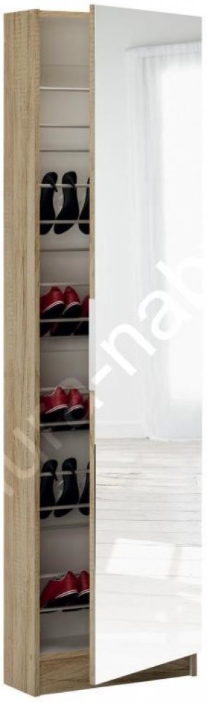 Provedení:Jednoduchý a moderní skříňový botník je vyroben z laminované dřevotřísky v barevném provedení dub. Přední stranu dveří tvoří praktické zrcadlo opatřeno kovovou úchytkou. Za dvířky botníku se nachází šest polic, které nabízí prostor pro 12 párů bot.Montáž dveří je možná na levou i pravou stranu.Tento dřevěný botník je díky modernímu designu vhodný k použití do předsíní, hal nebo garáží k ...