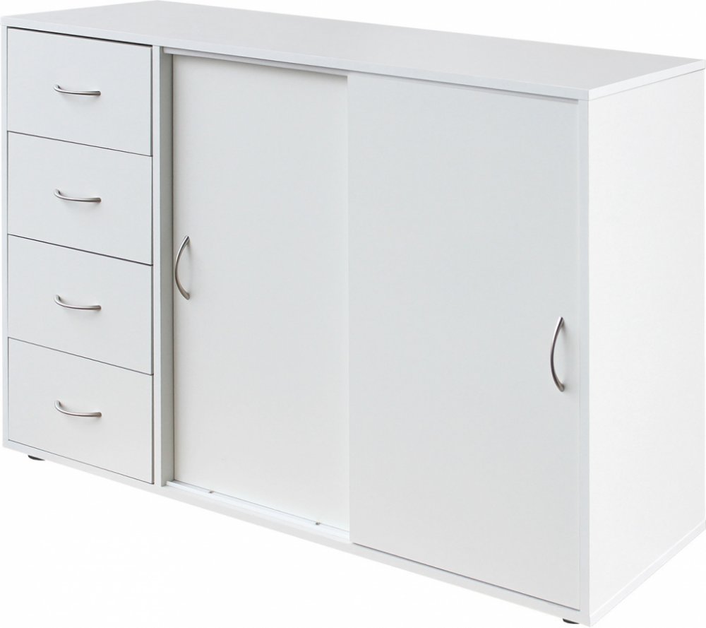 Elegantní komoda je zhotovena z laminované dřevotřísky v bílé barvě.