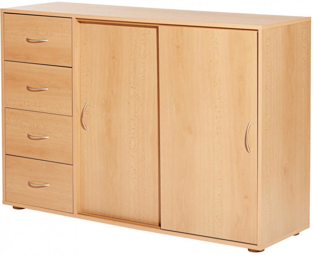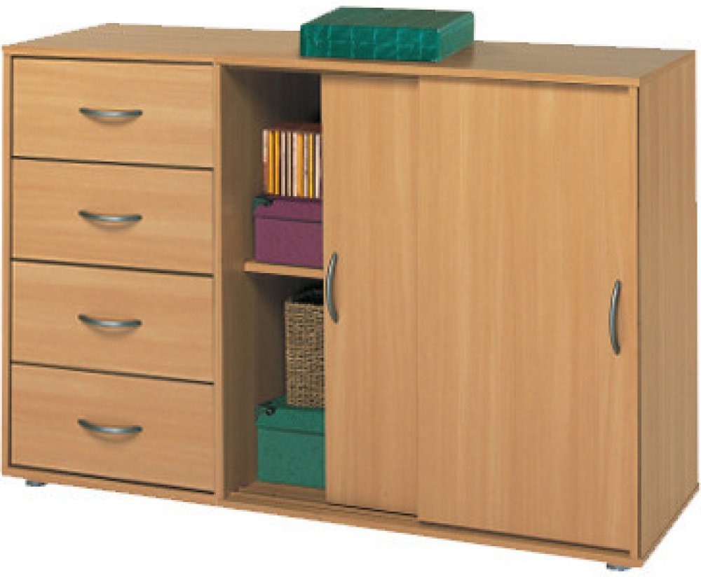V levé části disponuje komoda zásuvkami. Střední a pravá část se skládá z dvířek ukrývajících variabilně nastavitelnou polici.