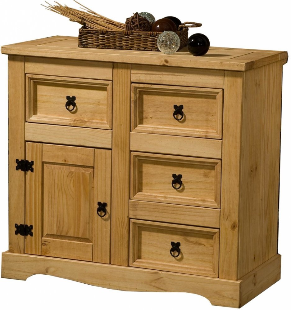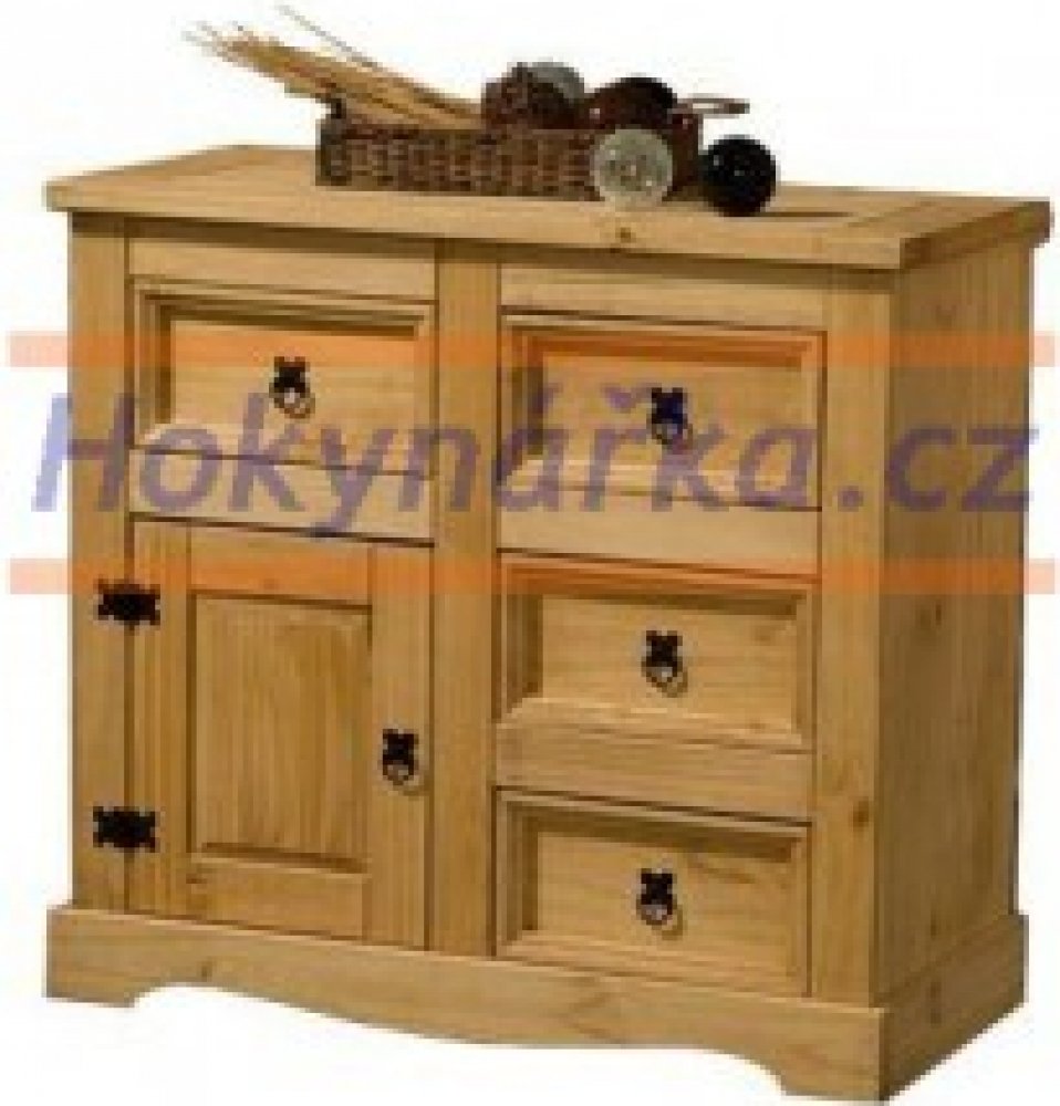 Komoda je vyrobená z borovicového masivu, který je povrchově zakončen voskem v medovém odstínu. Dekorační transparentní vosky odpuzují vodu a nečistoty. Tato komoda má jedny dvířka a čtyři menší zásuvky s kovovými úchytky.