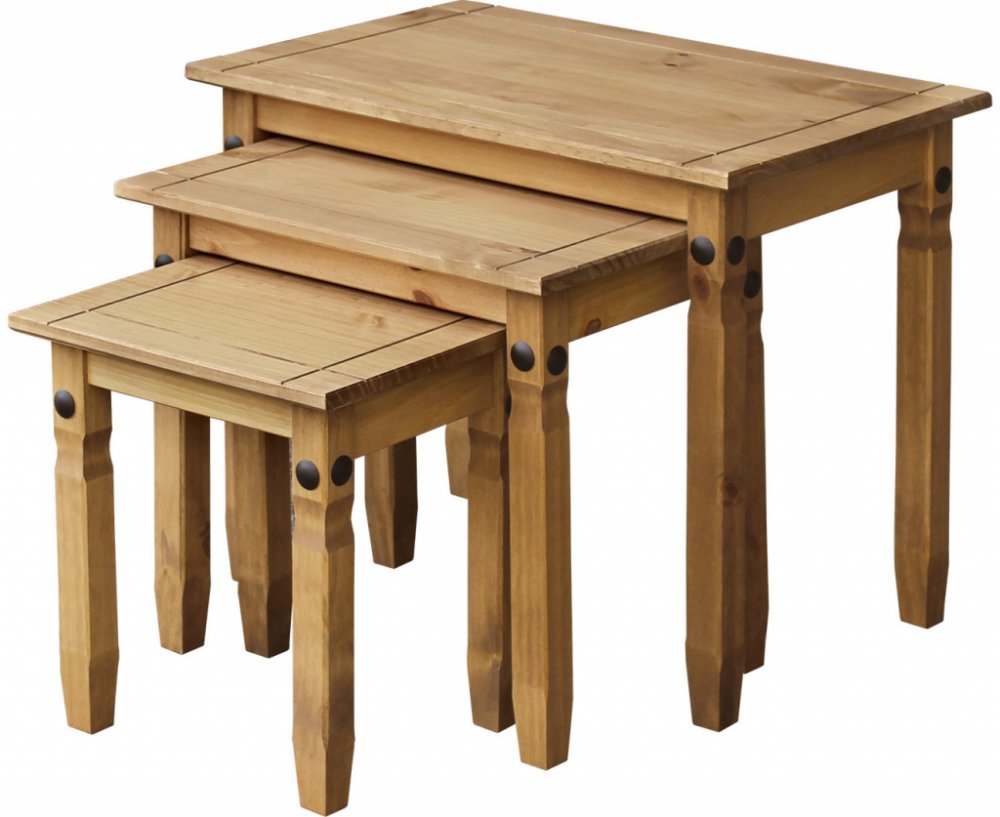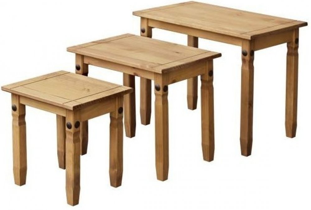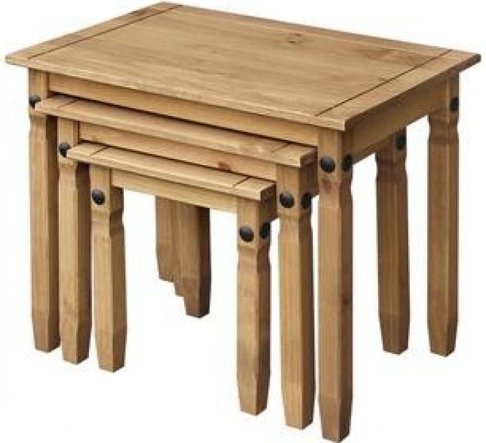 Sada 3ks Corona konferenčních stolků, materiál dřevěný z masivního dřeva borovice, povrchová úprava - voskované v medovém odstínu. Rozměry stolek 1: 66x42x54cm (š x h x v), stolek 2: 52x37x47cm (š/h/v), stolek 3: 38x32x40cm(š/h/v).