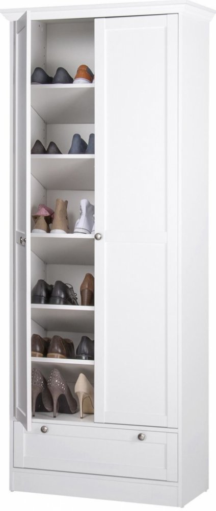 Skříň 2 dveře + 1 zásuvka LANDWOOD 13 - materiál kombinace MDF / lamino, barevné provedení bílá víceúčelová skříň, variabilní police možno umístit rovně i šikmo (jako botník) 2 dveře, 1 zásuvka, 5 polic, úchytky starožitného vzhledu součást sestavy Landwood