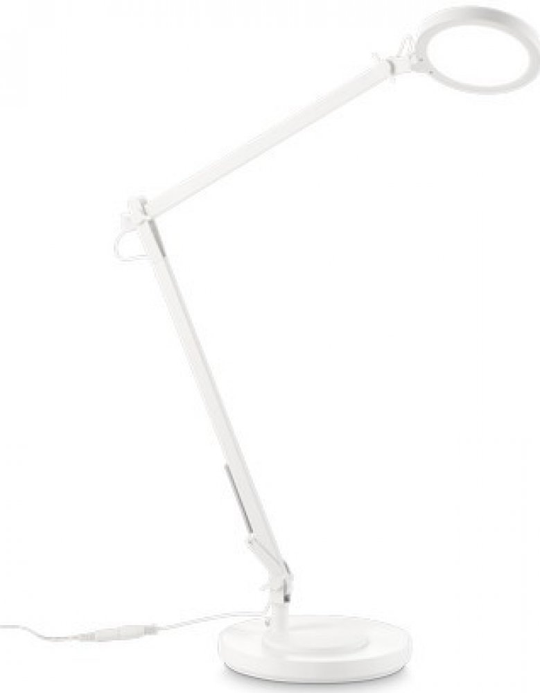 Futuristická LED stolní lampa FUTURA z kolekce designového osvětlení Ideal Lux v bílém provedení o výšce 65,5 cm vhodná k nasvícení pracovního nebo studijního stolu v moderně laděném interiéru nebo kanceláři. Kulatá základna spolu s kloubovým flexibilně nastavitelným ramenem je vyrobena z kvalitních materiálů, jako je hliník a plast. Placatý difuzor kulatého tvaru, který lze otáčet a vyklápět jej, vyzařuje studené bílé světlo s teplotou chromatičnosti 4000 K, které poskytuje integrovaný LED zdroj s příkonem 1 x 10 W a svítivostí 750 lm. Tento zdroj s dlouhou životností až 25.000 hodin je součástí svítidla a nelze ho vyměnit. Lampa obsahuje integrovaný dotykový vypínač a zároveň stmívač, který je nenápadně umístěn na hlavě difuzoru. Její rozměry činí 65,5 x 58 x 18,5 cm. Krytí IP20 vyjadřuje vhodnost pro použití do interiéru. Svítidlo je určeno k napájení ze sítě na 220-240V a vztahuje se na něj záruka 5 let.
