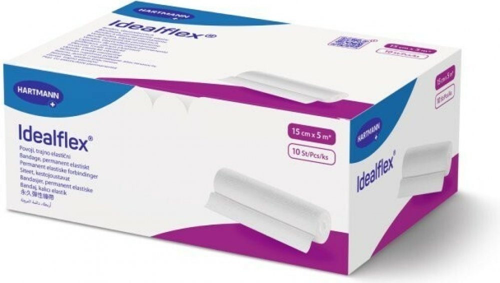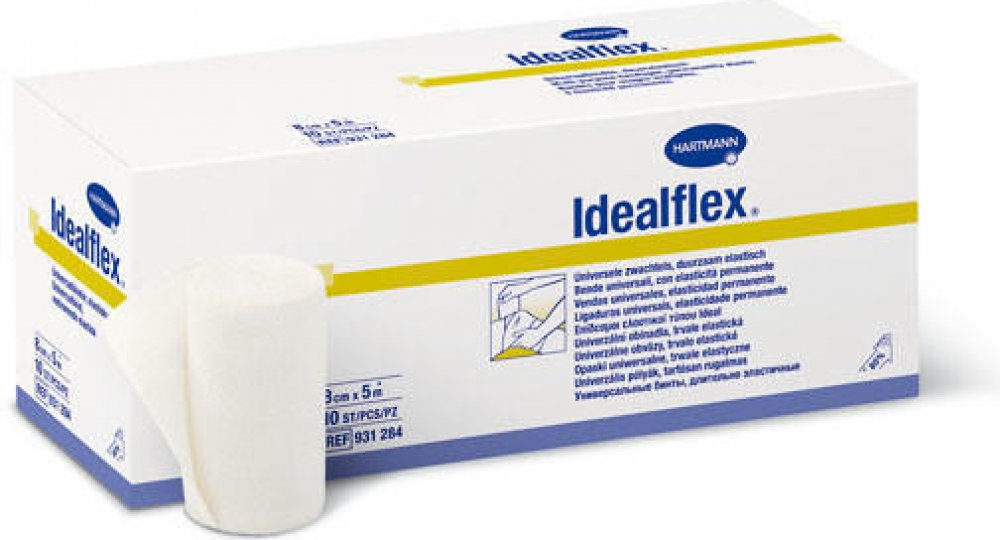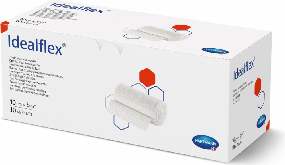 Trvale elastické krátkotažné obinadlo. Trvale elastické krátkotažné obinadlo.Vlastnosti výrobku: Idealflex je charakteristický nízkou tažností, která způsobuje tuhou kompresi s vysokým pracovním a nízkým klidovým tlakem. Obinadlo je měkké, prodyšné a při nošení se nevytahuje. Možno přiložit i na kónické části těla, kde bezpečně sedí. Produkt lze prát při teplotách do 60 °C. Tažnost 90 %.Aplikace: Krátkotažné obinadlo Idealflex se používá jako podpůrný a odlehčovací obvaz při poškození pohybového aparátu. Lze ho využít i jako sportovní bandáž a k připevnění dlah. Je vhodné k ošetřování akutních a chronických onemocnění žilního a lymfatického systému u mobilních i imobilních pacientů. Obinadlo je vhodné k zahájení i k pokračování léčby a je možné ho přikládat až do doby úplného ustoupení otoku, případně vyhojení vředu.Rozměr: 10 cm x 5 m