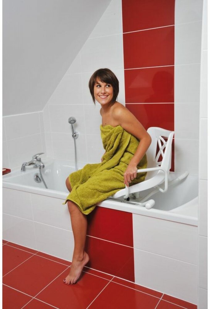 Toto sedátko do vany ve tvaru židle je otočné o 360°. Je vhodné pro usnadnění přístupu do vany pro osoby se sníženou pohyblivostí.