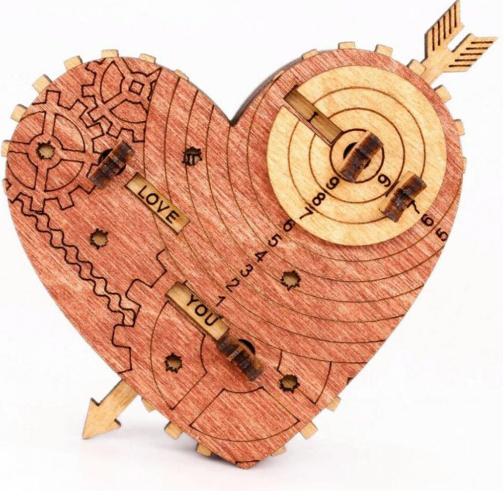 Tento hlavolam byl vyvinut jako zábavná krabička na Valentýna nebo jinou podobnou příležitost. Klíčem k otevření trezoru je věta složená ze 3 slov, která lze změnit - na každém ze 3 koleček je 8 slov a dohromady je více než 50 možných kombinací. Výchozí kód je „I LOVE YOU“. Kód se skládá ze 3 slov a z uvedených možností si můžete vybrat kombinaci, která vám nejvíce vyhovuje: kolečko 1: I, SAVE, I’M, YOU’RE, FIND, BE, TAKE, OPEN kolečko 2: LOVE, HATE, BEST, SWEET, MY, YOUR, WANT, LUCKY kolečko 3: YOU, PUZZLE, HEART, SEX, JULIET, BEER, VEGGIE, ROMEO Tímto jedinečným dárkem se zaručeně dostanete do srdce vaší drahé polovičky. Rozměr srdce: 7 × 4 × 1,3 cm