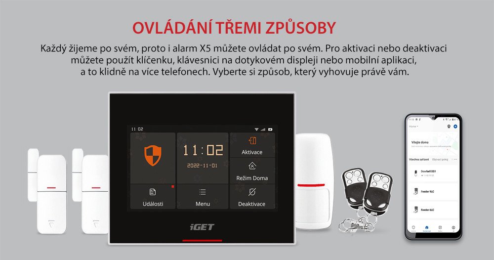 - Aktivace a deaktivace alarmu probíhá pomocí klávesnice na displeji/klíčenek/aplikace.