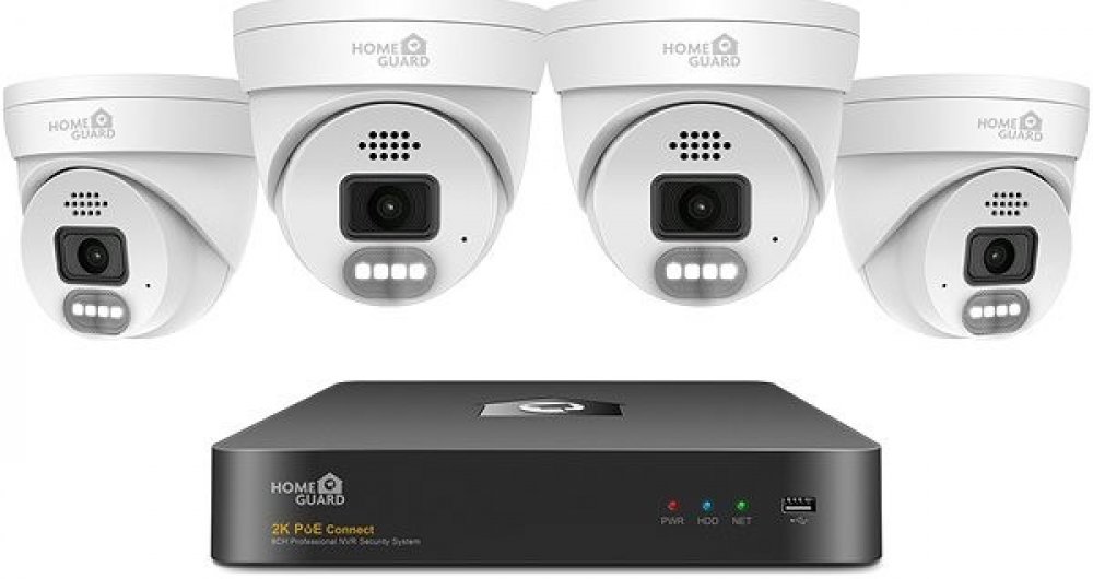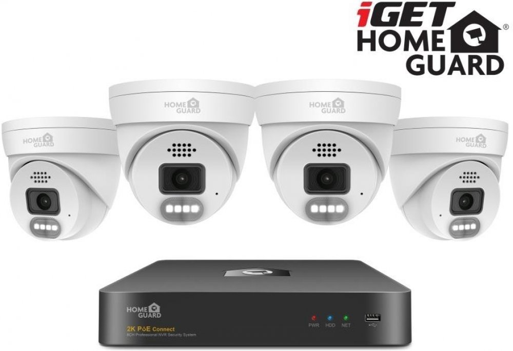 Kamerový systém iGET HOMEGUARD HGNVK84804 s rozlišením Super HD 2K (2560 x 1440), obousměrným přenosem zvuku, barevným nočním viděním, sirénami, PoE napájením a SMART detekcí pohybu. 8-kanálový 2K rekordér NVR s PoE napájením + 4x HGNHK937CAM 2K (4MPx) PoE barevná venkovní kamera s LED svícením a výstražnými LED, myš, kabeláž, pozice pro 1x HDD SATA až 10 TB, podpora ONVIF ver.2.6.
