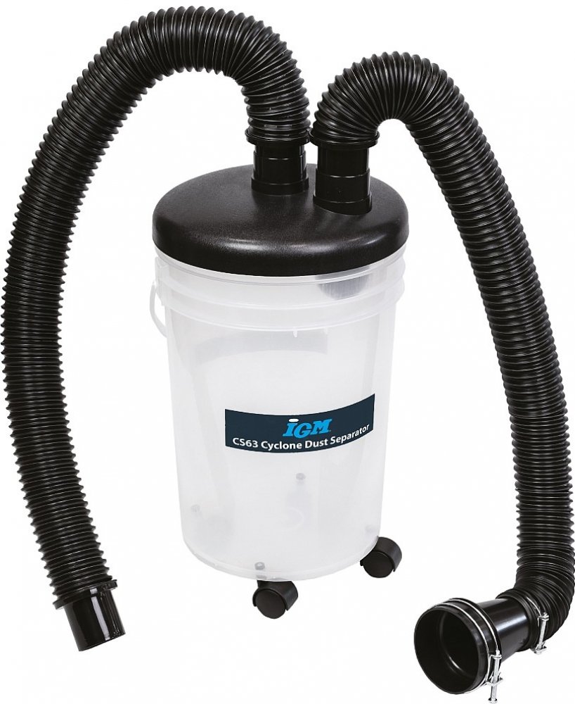 Cyklonový separátor pilin a prachu pro vysavače i odsavače šetří náklady a zvyšuje životnost filtrů. Balení obsahuje i sací hadice o průměru 63 milimetrů. Kompatibilní se všemi typy dílenských vysavačů a odsavačů.• Separátor pilin a prachu pro vysavače.• Šetří náklady na odpadní sáčky a prodlužuje životnost filtrů vysavače.• Kompatibilní se všemi průmyslovými vysavači se sacími hadicemi 63 mm.Separátor pilin IGM CS63 odděluje dřevěné třísky,piliny a prach do odpadní nádoby,čímž snižuje poškození vysavače,prodlužuje životnost filtrů a šetří náklady na odpadní sáčky do vysavače.Separátor se připojuje mezi váš vysavač a elektronářadí či frézovací stolek nebo ho můžete využít pouze s vysavačem při úklidu vaší dílny.Díky jednoduchému designu stačí připojit koleno na spodní stranu víka a nasadit ho na odpadní nádobu.Nádoba se tak utěsní a po zapnutí vysavače v ní vznikne podtlak,čímž se většina vysávaného odpadu usadí v nádobě.Součástí separátoru jsou dvě plastové flexi hadice o průměru 63 mm pro propojení separátoru s vysavačem a nářadím.Flexi hadice se k víku připevňuje spojkou 63 mm,která má závit pro pevný spoj.Hadici lze připojit k vysavači buď pomocí spojky 63 mm nebo hadicovou sponou.Druhou hadici pak můžete připojit k elektronářadí nebo ji využít na úklid dílny.Místo spojky lze přímo na víko nasadit adaptér 63/36 mm pro připojení libovolné hadice 36 mm,jako je například sací hadice Festool.Separátor je primárně určený pro vysavače,připojit ho ale lze i k odsavači po nasazení adaptéru 63/100 mm na víko a upnutí odsávací hadice 100 mm pomocí hadicové spony.Upozornění! Při vysávání podlah otevřete otvor pro vedlejší nasávání vzduchu na madle vašeho vysavače,jinak dojde k deformaci nádoby.Upozornění! Koleno nesmí směřovat pod středový otvor,jinak separátor nebude správně fungovat.• Objem nádoby: 32 lObsah balení:• Odpadní nádoba s víkem• 2x Flexi hadice 63 mm• Koleno• 3x Spojka 63 mm• Adaptér 63/100 mm• Adaptér 63/36 mm• Hadicová spona drátová 63 mm• Hadicová spona drátová 100 mm