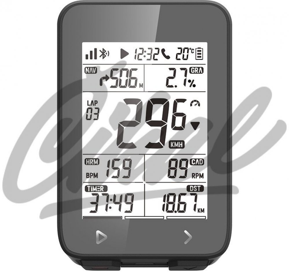 více než 20 funkcí: aktuální čas, čas jízdy, ujeté kilometry, teplota, okruhy, aktuální/průměrná/maximální rychlost, nadmořská výška, sklon, aktuální/maximální tepová frekvence, aktuální/průměrná/max. kadence, kalorie,