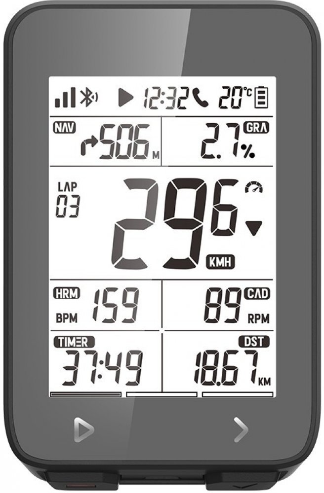 více než 20 funkcí: aktuální čas, čas jízdy, ujeté kilometry, teplota, okruhy, aktuální/průměrná/maximální rychlost, nadmořská výška, sklon, aktuální/maximální tepová frekve...