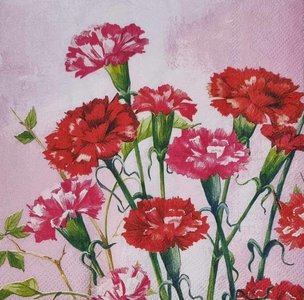 Klíčová slova: květiny, karafiáty, květy, ubrousky, ruční práce, decoupage, slavnostní nebo svatební tabule, ubrousky s potiskem, ubrousky s motivem, decoupage, ubrousková technika.