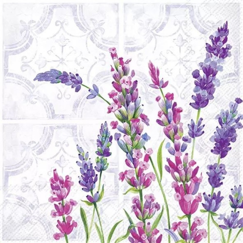 klíčová slova: levandule, květina, vzor, ormament, ubrousky, ruční práce, decoupage, slavnostní nebo svatební tabule, ubrousky s potiskem, ubrousky s motivem, decoupage, ubrousková technika.