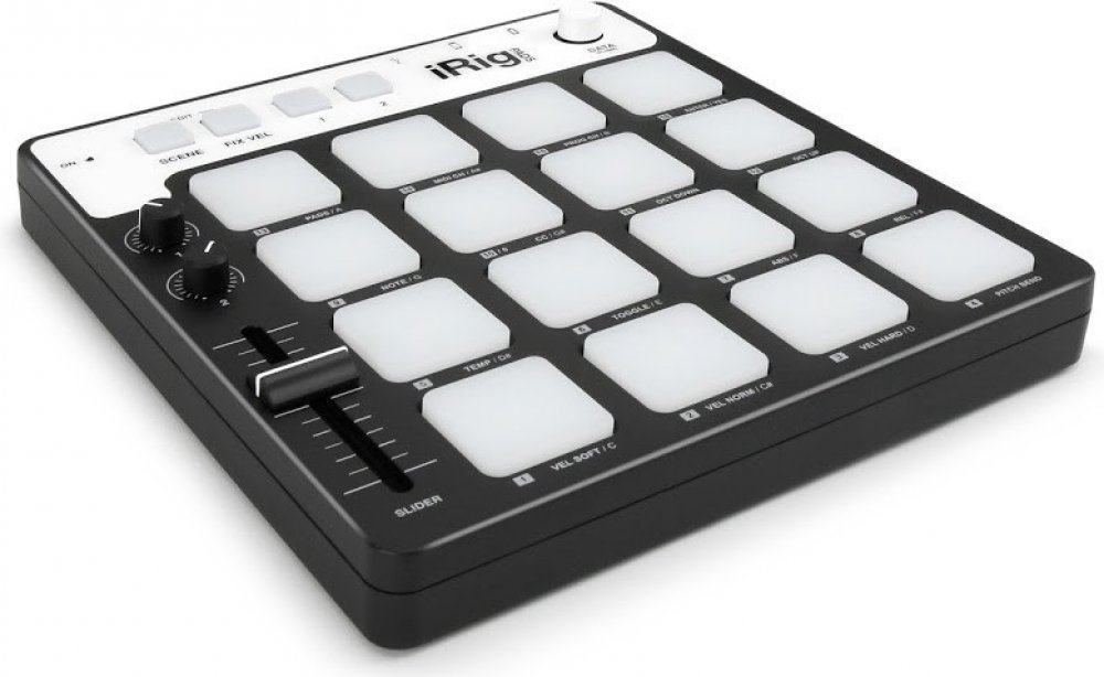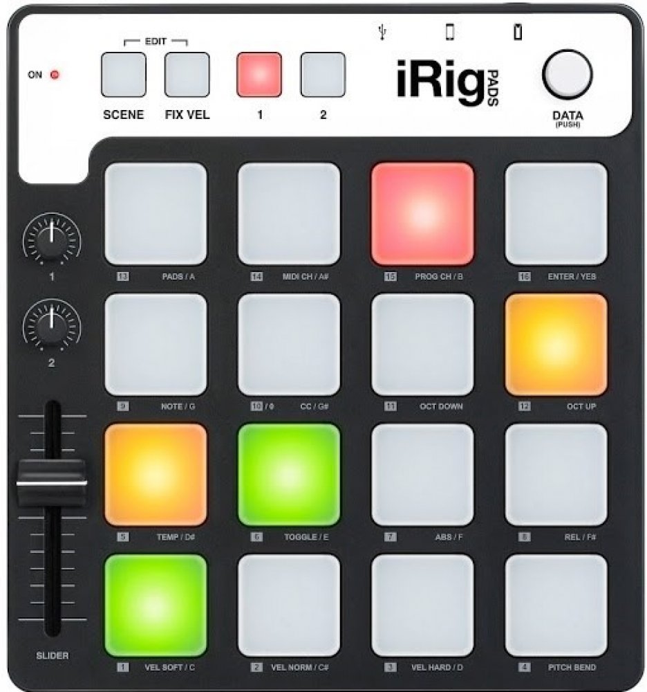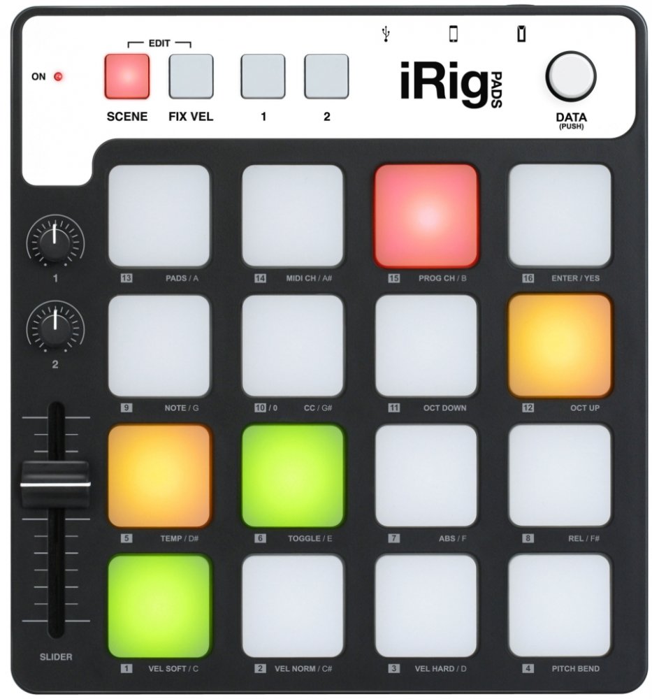 Groove na cestách IK Multimedia představuje iRig Pads, plně vybavený ultra-přenosný 16 padový MIDI groove ovladač pro iPhone, iPad a iPod touch, Mac a PC. Je to velmi univerzální systém, který vám umožní tvořit beaty, spouštět smyčky, mixovat jako DJ a mnohem více bez ohledu na to, zda jste na pódiu, ve studiu nebo kdekoliv jinde. iRig Pads je výborný společník na cesty pro mobilní producenty elektronické hudby. Technická specifikace: Ultra-přenosný padový MIDI ovladač a groove produkční stanice pro iPhone, iPad a iPod touch a navíc i pro Mac a PC. Velmi malé rozměry a tenké provedení, které si lze vzít s sebou kamkoliv. 16 rychlostně citlivých, podsvícený a pogumovaných padů, které světelně reagují v závislosti na rychlost odchozích a příchozích MIDI zpráv. 16 uživatelsky programovatelných MIDI scén pro okamžité vyvolání vlastních MIDI map. Obsahuje předprogramované MIDI scény pro SampleTank pro iPhone a iPad. Plně MIDI „class-compliant“. Ideální pro vytváření beatů, smyček a DJing. Součástí USB kabel a kabel s Lightning konektorem (30-pinový kabel nutné dokoupit zvlášť). Vstup pro expression/sustain pedál. Po připojení k iOs lze přes USB port tyto zařízení napájet, tudíž nehrozí vybití baterie.