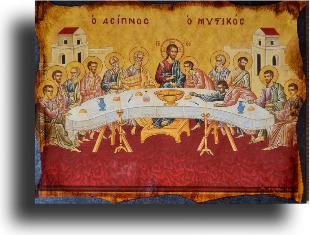 Tato byzantská ikona znázorňuje Poslední večeři – Mystickou večeři Ježíše Krista s jeho dvanácti učedníky, jak ji podává pravoslavná tradice. Nejde o pouhou vzpomínku na historickou událost, ale o zobrazení nadčasového tajemství, ve kterém se Kristus vydává světu jako Beránek Boží.