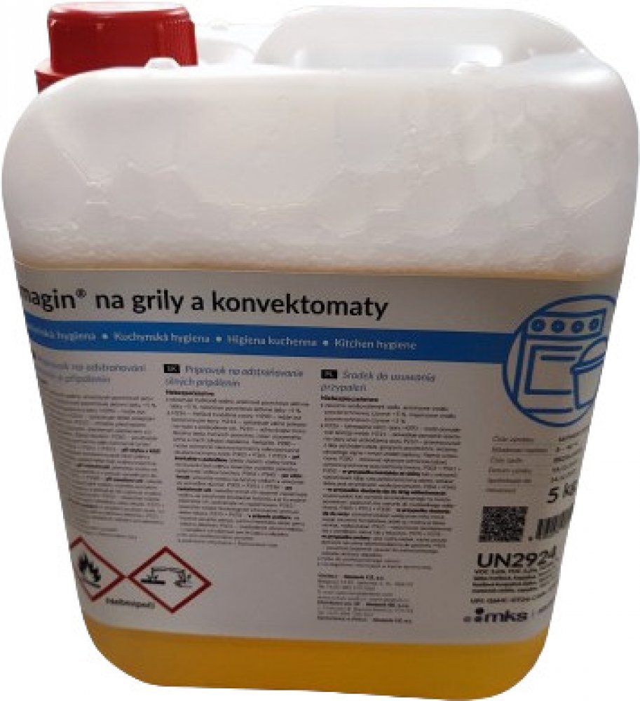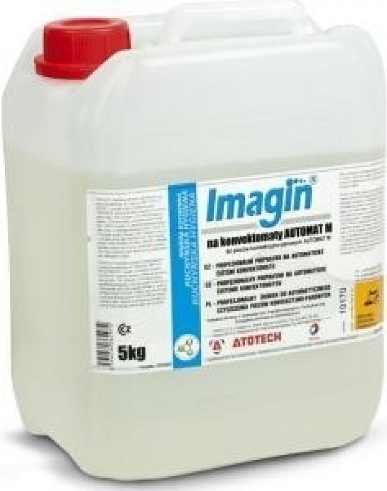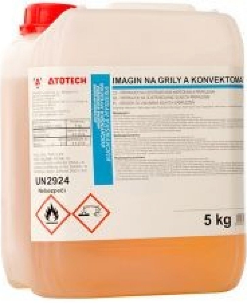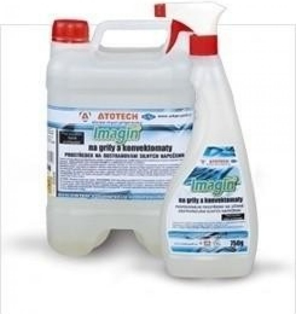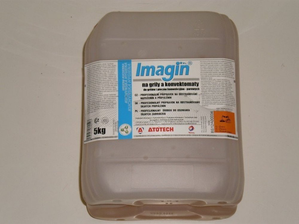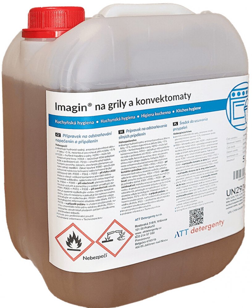 IMAGIN na grily a konvektomaty je vysoce účinný aktivní přípravek pro odstraňování silných připečenin. Speciální receptura tohoto přípravku zajišťuje, že při nastříkání nestékání z plochy. Umožňuje tím velmi rychlé a efektivní odstranění zbytků připečených pokrmů. Není vhodný pro čištění předmětů z barevných kovů a hliníku! Po každé aplikaci Imagin na grily a konvektomaty je důležité předměty řádně opláchnout čistou vodou. Prostředek je vhodný i k VYVAŘOVÁNÍ FRITÉZ. Pro tento účel použití se zředí Imagin® na grily a konvektomaty v poměru 1:10 s vodou ve fritéze a nechá se přejít varem. Poté zařízení řádně vypláchnout čistou vodou. Pokyny pro bezpečné zacházení včetně podmínek skladování a údaje o nebezpečnosti přípravku jsou uvedené v Bezpečnostním listu.