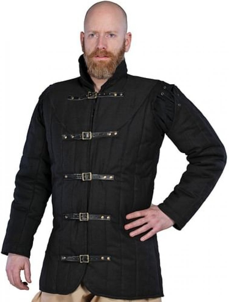 Gambeson nebo též krzno či prošívanice je kabátec zhotovený z prošívané látky, byl nošen ve středověku pod zbrojí, ať kroužkovou či plátovou. Námi nabízený gambeson je černé barvy, má odnimatelné rukávy a zapíná se přezkami (kožený řemínek se sponou). Je dostatečně hrubý - hustota materiálu je 400 gramů na metr čtvereční (ramena mají 600g / m2). Může být užit jak pod zbroj, tak samostatně, jako po...