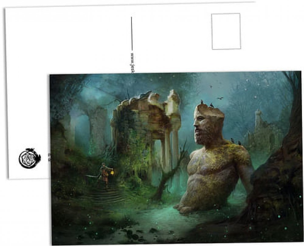 Procházíte temný les, bažinu a konečně ji vidíte. Tajemná ztracená svatyně, ve které na vás čeká něco, co rozhodne o osudu světa. Nejvyšší čas poslat domů pohled! Klasická pohlednice s motivem z RPG Jeskyně a draci.