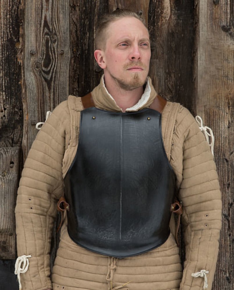 Kvalitní černěný přední kyrys je vyroben z 1 mm silného plechu. Plně ochrání hruď a břicho. Pomocí dvou řemenů z prvotřídní kůže drží kyrys na místě i během pohybu a bitvy. Univerzální tvar a styl kyrysu zapadne do celé řady kostýmů. Pod kyrys doporučujeme gambeson.