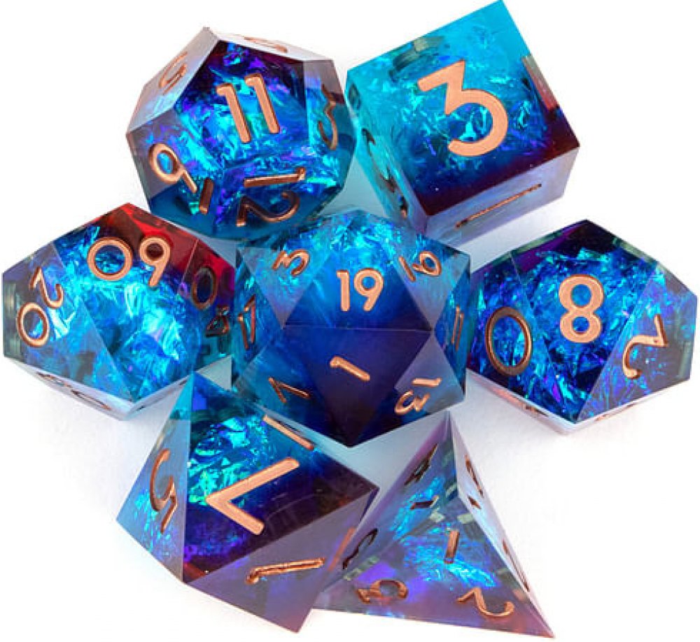 Sada sedmi vícestranných průsvitných kostek s ostrými hranami sharp edge Poseidonův hněv, evokující rozbouřený oceán. V závislosti na světelných podmínkách se může barva kostek lehce lišit od produktové fotografie. Vzhledem k ostrým hranám, doporučujeme pro prodloužení jejich životnosti používat měkčenou házecí podložku - dice tray. Sada obsahuje k4, k6, k8, k10, k12, k20 a k%. K6 má hranu 1,6 cm.