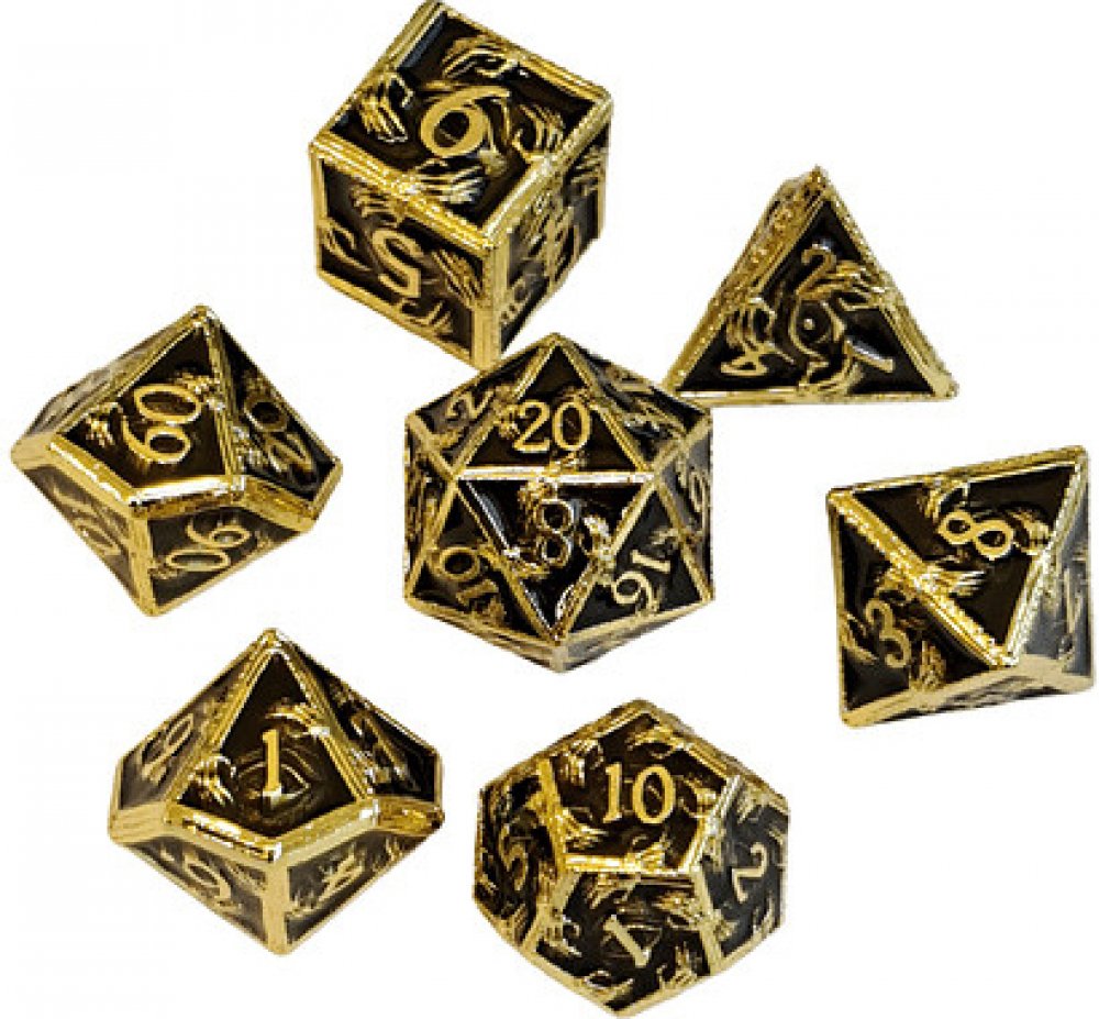 Dokážeš Midasovo prokletí proměnit ve svůj úspěch? Dotkni se kostky, která se třpytí zlatem! Tato sada zlato-černých kovových kostek má na každé kostičce vyobrazení zlatých rukou a očí, které dohlížejí na tvé hody. Kostky jsou těžké a dobře se kutálí. Zároveň nejsou ostré, takže nehrozí, že si jimi poškodíš oblíbenou házecí podložku nebo váček.Tahle sada je ideální pro všechny dobrodruhy v RPG, kteří se nebojí kleteb a dotek měnící věci ve zlato přijmou s nadšením a dychtivostí. V balení najdeš kostky k4, k6, k8, k10, k12, k20 a k%.