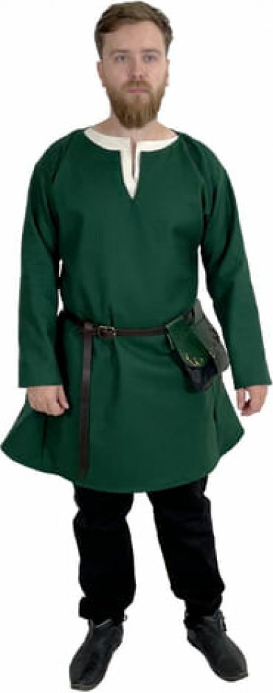 Tuniku, která tě nenechá napospas chladu ani pohledům ostatních! Ušitá podle střihů z 12.–15. století, z kvalitní vlny, která hřeje, dýchá a drží tvar i po celém dni ve zbroji, u ohně nebo v dešti. Zelená barva snadno zapadne mezi přírodní tóny – ladí s hnědým pláštěm, koženým opaskem i jednoduchými nohavicemi. Volný střih zajistí pohodlí, ať už běžíš do bitvy nebo jen sedíš s číší medoviny v krčmě. A pokud se ochladí, stačí přidat naší dlouhou bavlněnou spodní tuniku a vrstvit.