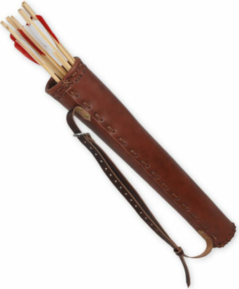 Ručně vyráběný toulec z hovězí kůže určený k nošení přes rameno. Je opatřen stavitelným popruhem, švy jsou svázené koženou tkanicí. Toulce vyrábíme v naší dílně, k mání v různých barevných variantách.