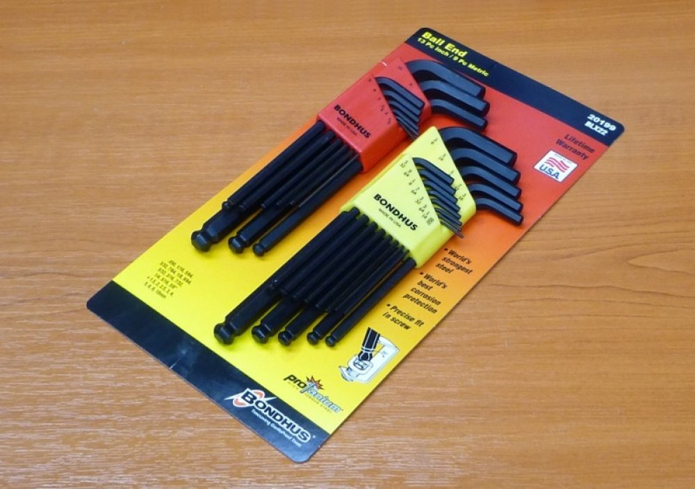 2 sady imbusových klíčů (10999+10937). Sada imbusových klíčů 10999 s kuličkou (metrika)Rozměry:1,5mm, 2mm, 2,5mm, 3mm, 4mm, 5mm, 6mm, 8mm, 10mm. Sada imbusových klíčů 10937 s kuličkou (palce)Rozměry: .050", 1/16", 5/64", 3/32",7/64", 1/8", 9/64", 5/32", 3/16", 7/32", 1/4", 5/16", 3/8". Klíče jsou vyrobeny z oceli Protanium, která je až o 20% pevnější než běžné druhy oceli. Kulové zakončení imbusových L-klíčů značky BONDHUS umožňuje práci pod úhlem až 25 stupňů.…