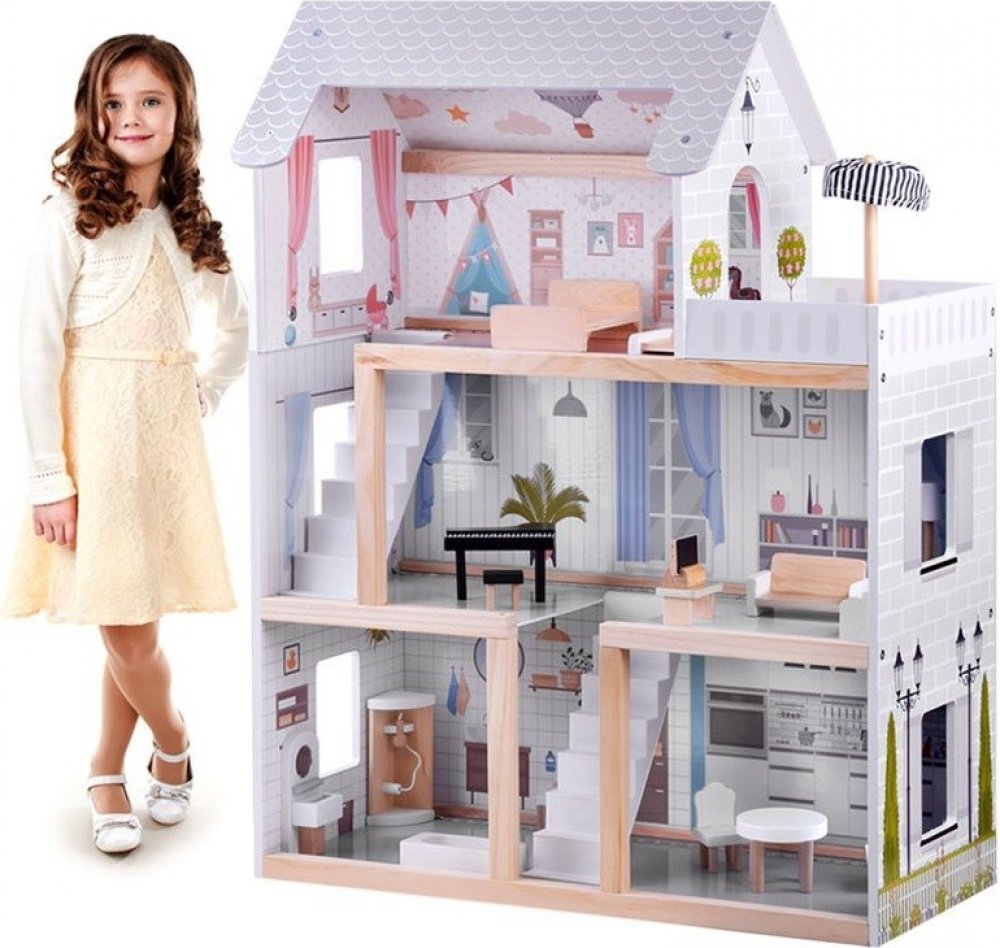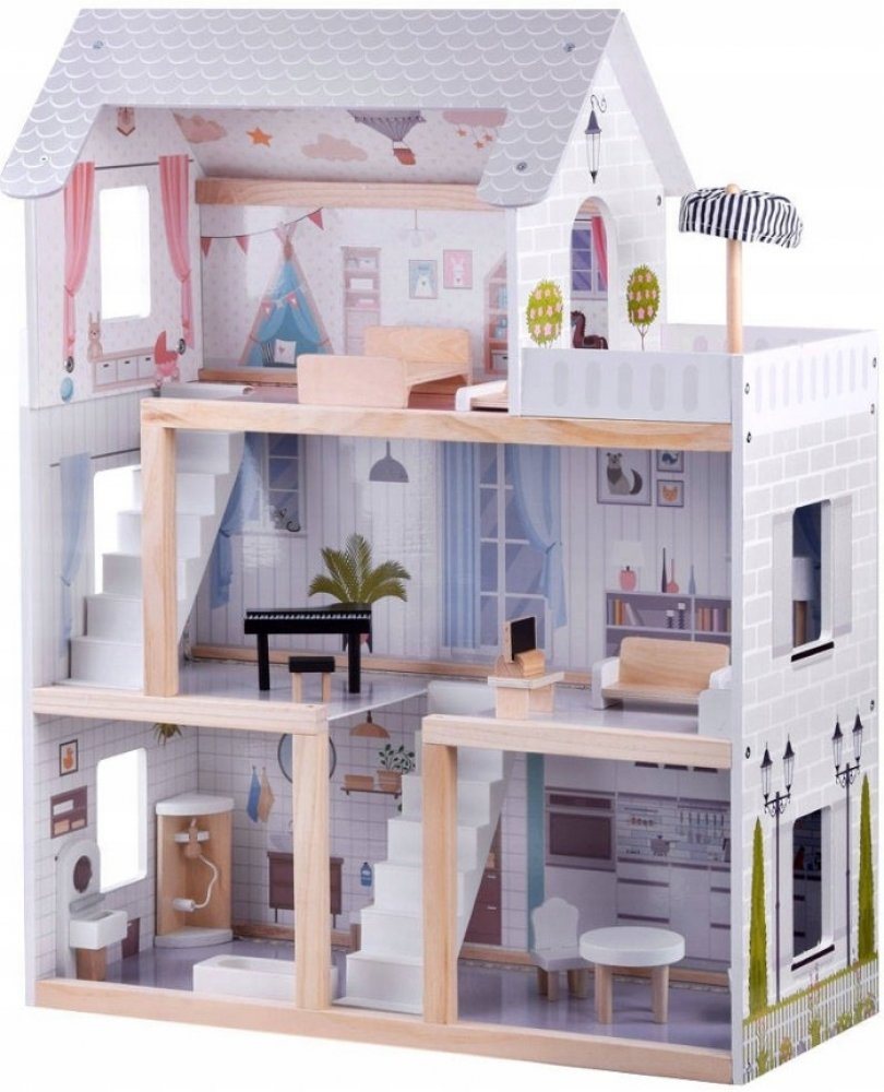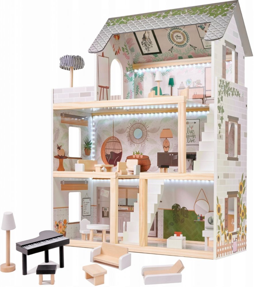 Dřevěný domeček pro panenky s nábytkem je velmi krásná vila v boho stylu. Třípatrová vila má čtyři prostorné pokoje, terasu a schodiště. Barvy domu jsou velmi tlumené, stylové, zvoucí k životu. Nábytek v pokojích je v bílé a dřevěné barvě, což ještě více zdůrazňuje styl pokojů. V takové vile se bude každý cítit příjemně. Každá místnost v domečku je osvětlena LED páskami, které dodávají eleganci a ...