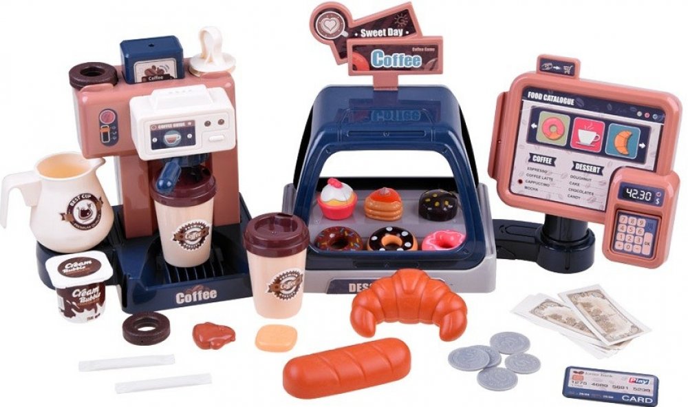 Kavárna s espresso kávovarem a pokladnou jistě osloví každého malého baristu. Celá sada se skládá ze 41 prvků a obsahuje vše, co je v každé kavárně nezbytné. Všechny prvky hračky (pokladna, kávovar, vitrína) lze libovolně kombinovat nebo používat samostatně. Hračka má světelné a zvukové efekty.