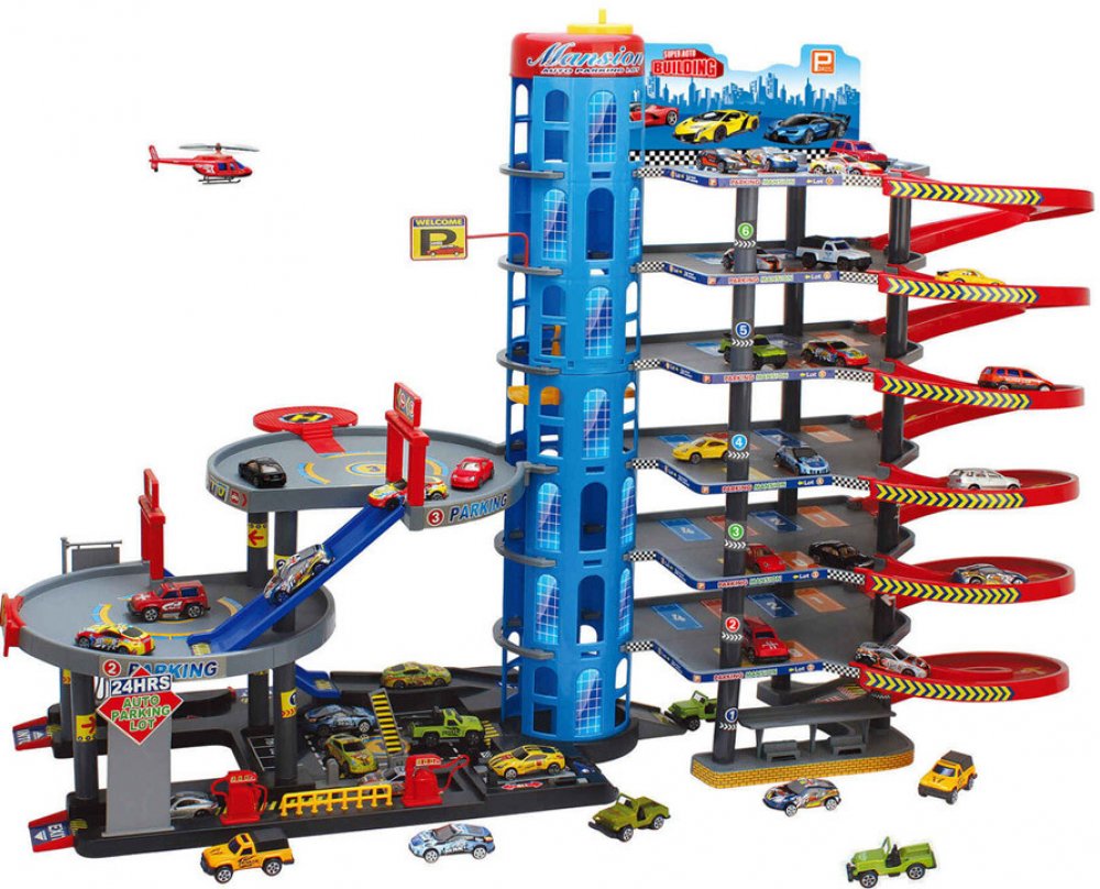 Obrovská (téměř 1 metr velká) 7úrovňová garáž pro auta s autíčky v soupravě je ideálním dárkem pro všechny kluky. Na další úrovně garáže se dostanete výtahem nebo skluzavkou. Hračka nevyžaduje použití baterií. Garáž má heliport, benzínovou stanici a funkční manuální výtah.