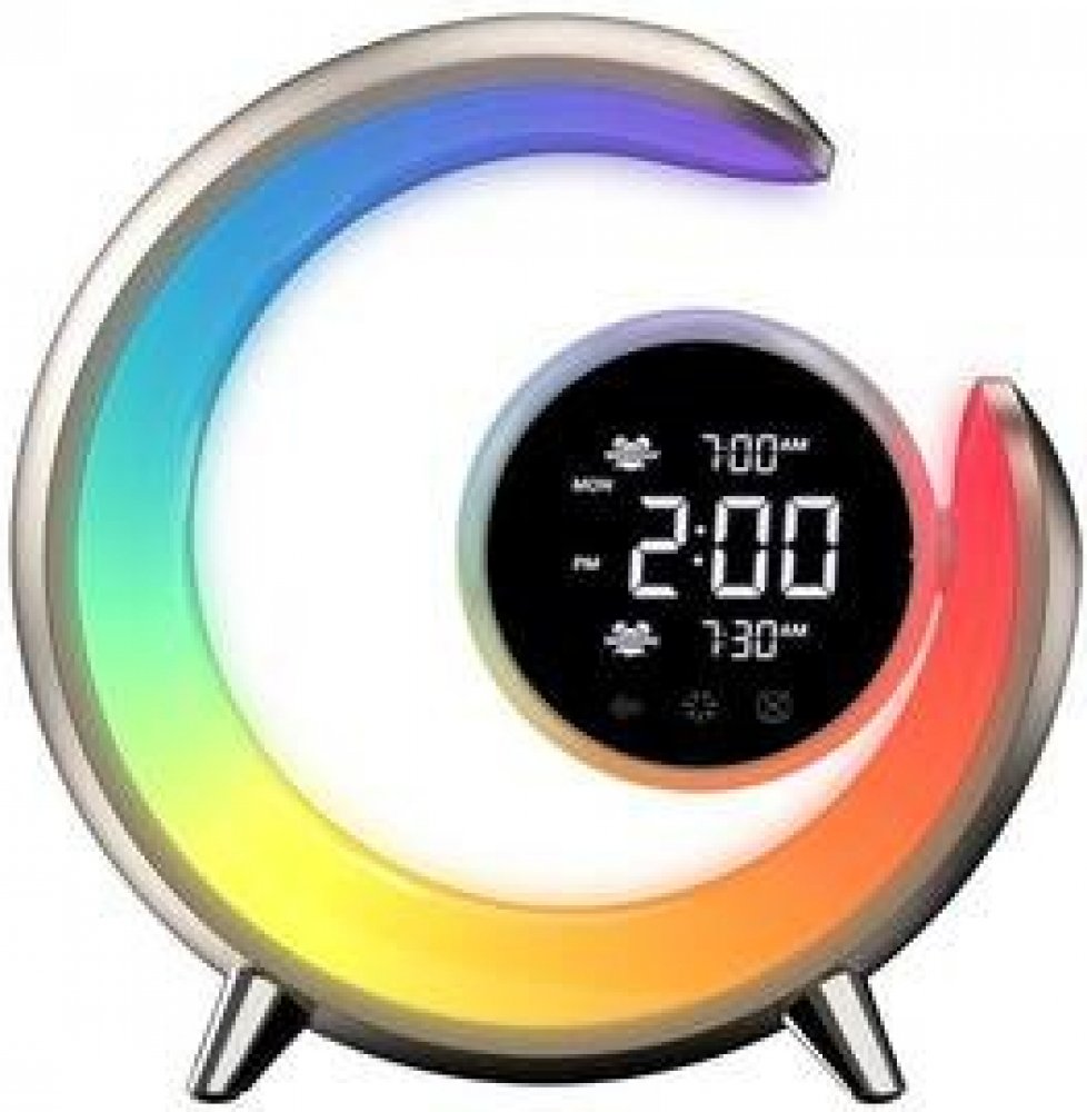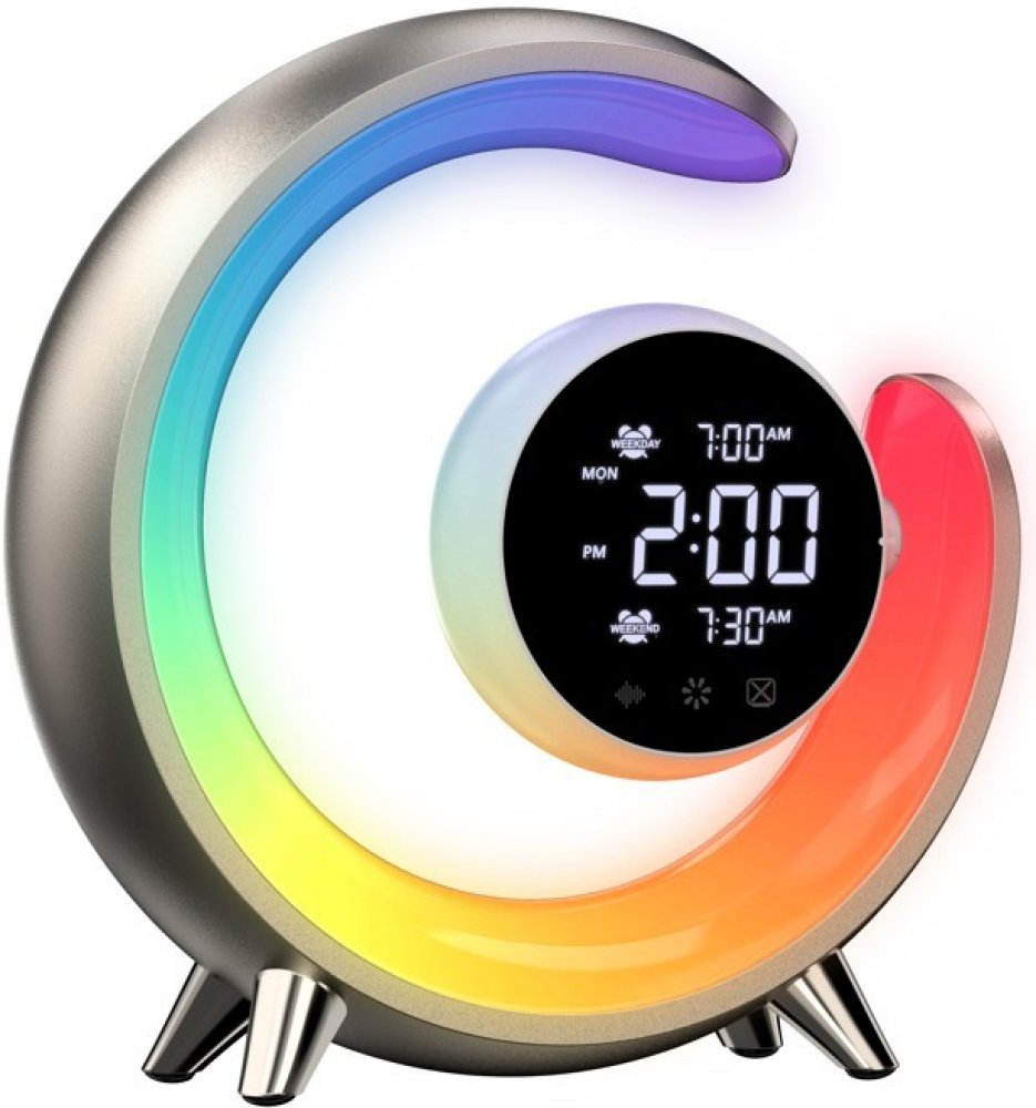 Netradiční LED stolní lampička s praktickým digitálním displejem a s efektním RGB podsvícením. Nabízí teplý odstín světla a plynulé stmívání. Tato lampička je ideální do dětských pokojíčků díky možnosti přehrávání sedmi různých přírodních zvuků k večernímu zklidnění. Samozřejmostí je poté automatické vypnutí v režimu 30/60/90 minut. LED displej disponuje dvoustupňovým nastavením jasu i možností úplného vypnutí. K dispozici je navíc i duální budík pro dva různé časy probuzení a USB výstup pro nabíjení mobilních telefonů.