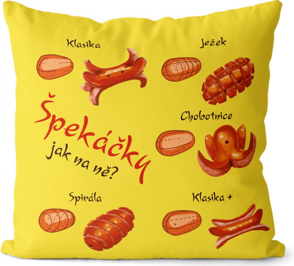 Vtipně a hravě. Jak si správně nařezat špekáčky? Mějte tento návod stále po ruce. Polštářek s motivy nařezaných buřtů jistě všechny pobaví. Navíc se Vám na něm bude skvěle relaxovat. Doplňte si interiér o zábavný kousek. Ideální dárek, který zaručeně potěší. Polštářek má rozměr 40x40 cm a skládá se z oboustranně potištěného povlaku se zapínáním a z vyjímatelné výplně. Materiál povlaku je 100% PES.