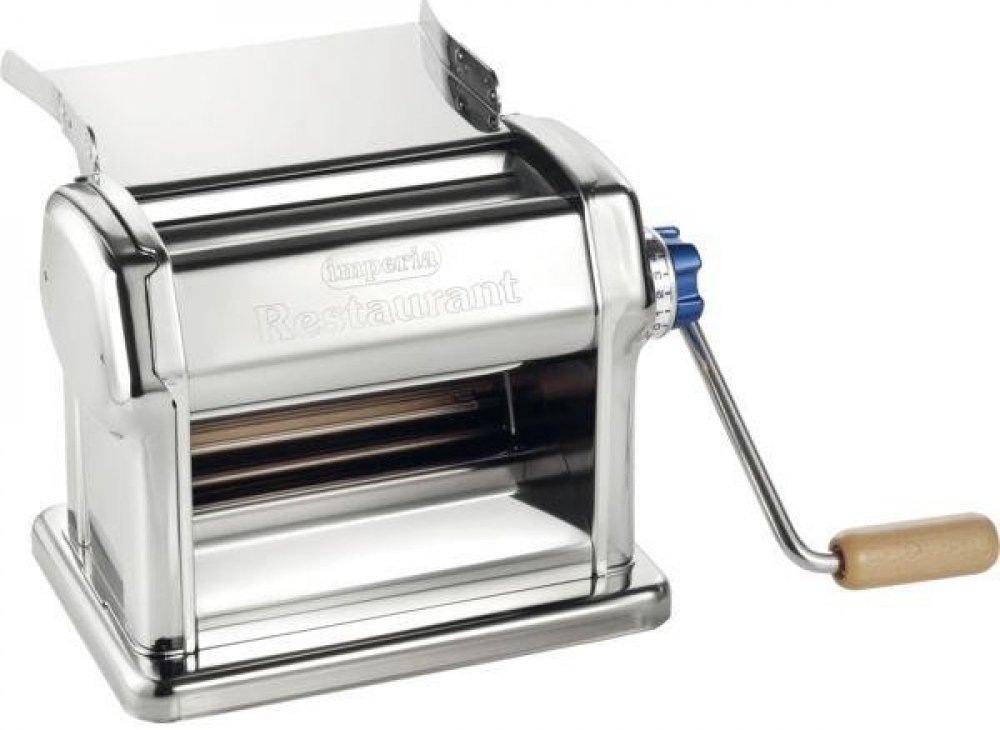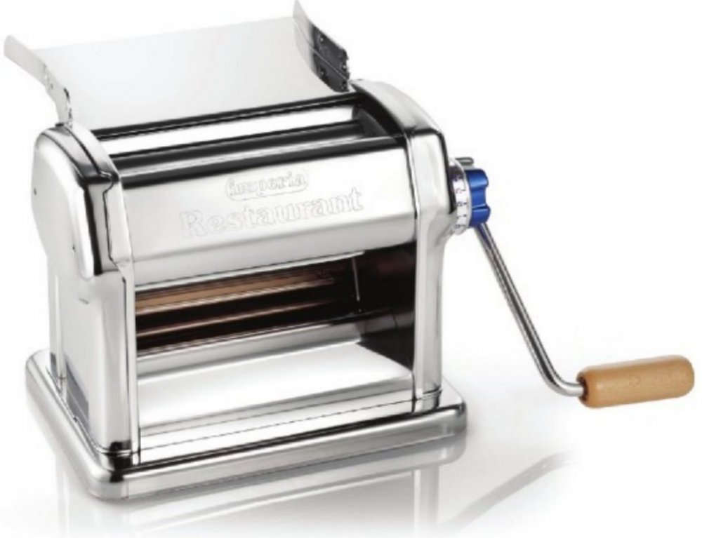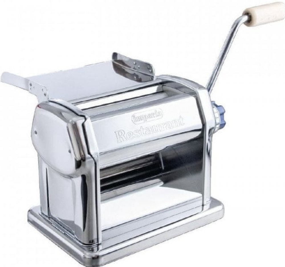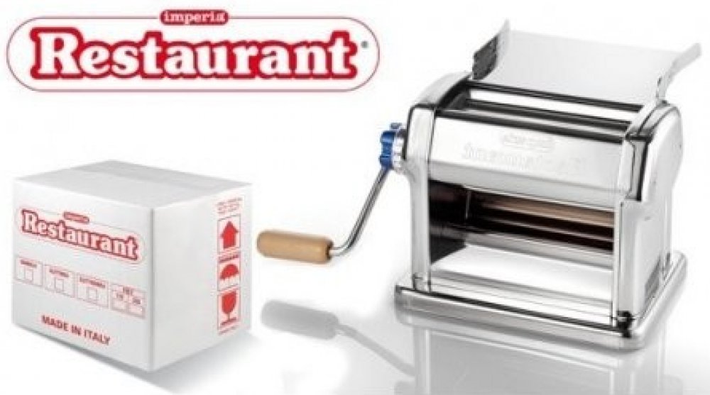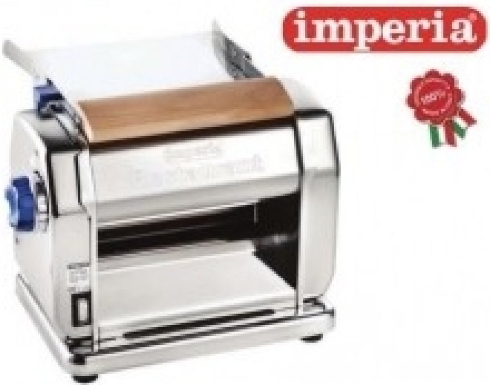 Krásný profesionální strojek na těstoviny. Samozřejmě z Itálie. Výrobce Imperia. Záruka 2 roky. Stroj váží 11,5kg i s příslušenstvím, čímž je klička k válcům na těsto (tlouška od 0mm do 5mm), plech na podávání těsta, úchytka ke stolu a klička k nástavcům, které na přání dovezeme. (tyto jsou už dodávané bez kličky). Strojek má rozměry 30x22x25 cm, měřeno bez kličky. Maximální šířka plátu těsta je 2...