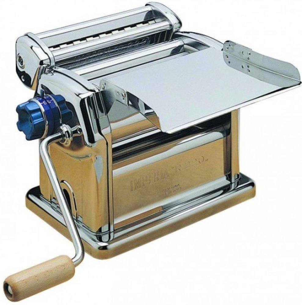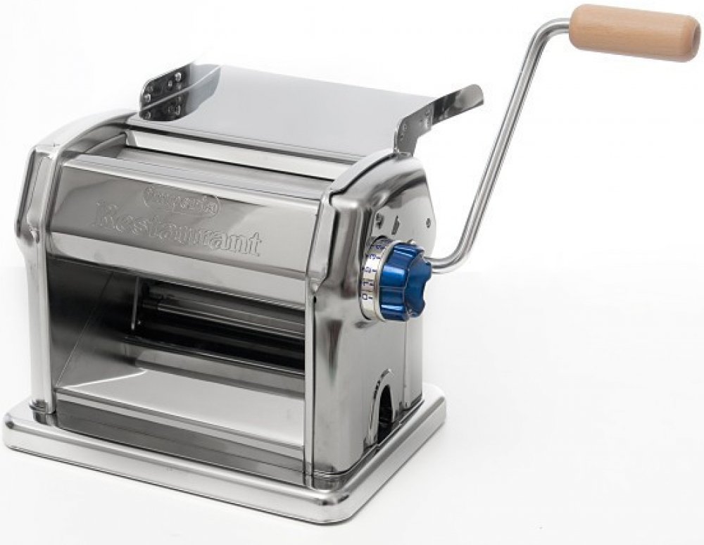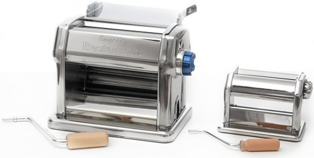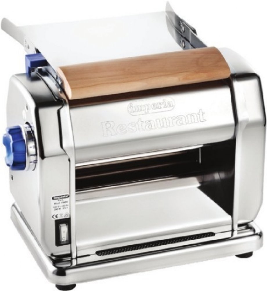 Krásný profesionální strojek na těstoviny. Samozřejmě z Itálie. Výrobce Imperia. Záruka 2 roky. Stroj váží 11,5kg i s příslušenstvím, čímž je klička k válcům na těsto (tlouška od 0mm do 5mm), plech na podávání těsta, úchytka ke stolu a klička k nástavcům, které na přání dovezeme. (tyto jsou už dodávané bez kličky). Strojek má rozměry 30x22x25 cm, měřeno bez kličky. Maximální šířka plátu těsta je 2...