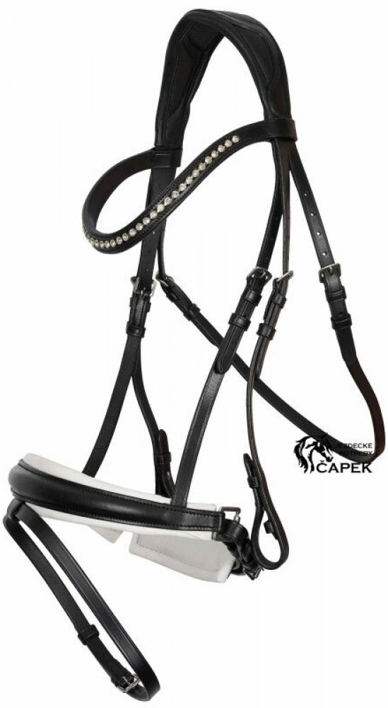 Vysoce elegatní uzdečka s anatomickým tvarem. ušlechtilá kvalitní kůže anatomický nátylník a nánosník pro maximální komfort měkce polstrovaný nánosník a nátylník širší švédský nánosník čelenka zdobená kamínky lícnice s háčky bez otěží Zákazníci hledají také: uzda na koně, jezdecká uzdečka