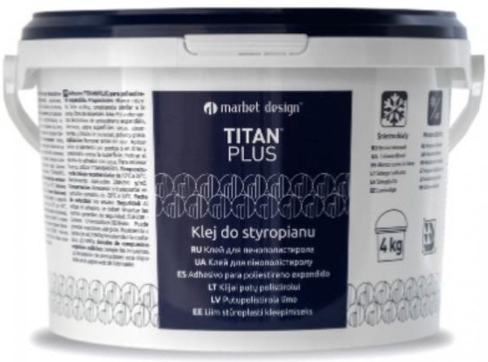 TITAN PLUS - lepidlo na polystyren.Balení: kbelíkObsah: 4kg Popis:akrylovésněhově bílépastové konzistenceneobsahuje rozpouštědlamrazuvzdorná do -20oCPoužití:Pro dekorativní výrobky z polystyrenu v interiéru na savé, suché povrchy zbavené prachu, nečistot a mastnoty.Pevnost: 480 g/m2
