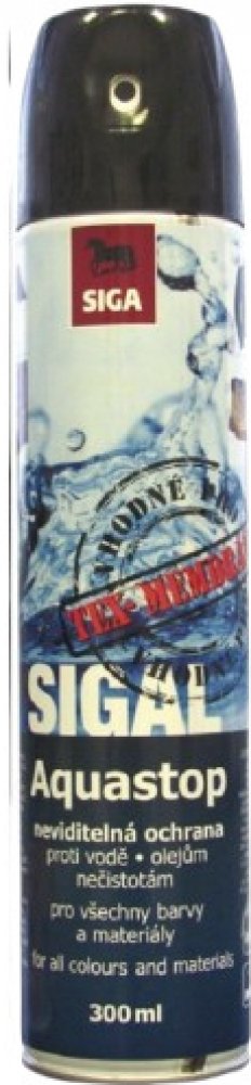 Impregnační sprej Aquastop o objemu 300 ml je český výrobek, který vyrábí firma Siga. Tento sprej s ošetřující a ochranou směsí na bázi FC-chemikálií vytváří po nástřiku na materiál tenký film. Ten poté chrání před pronikáním vlhkosti a kontaktu s vodou. Na povrchu materiálu zanechá kapky. Sprej má tu vlastnost, že po aplikování nesnižuje propustnost vodních par.