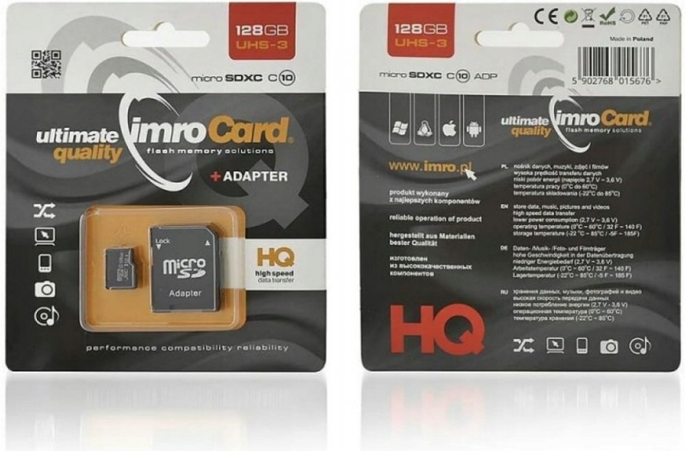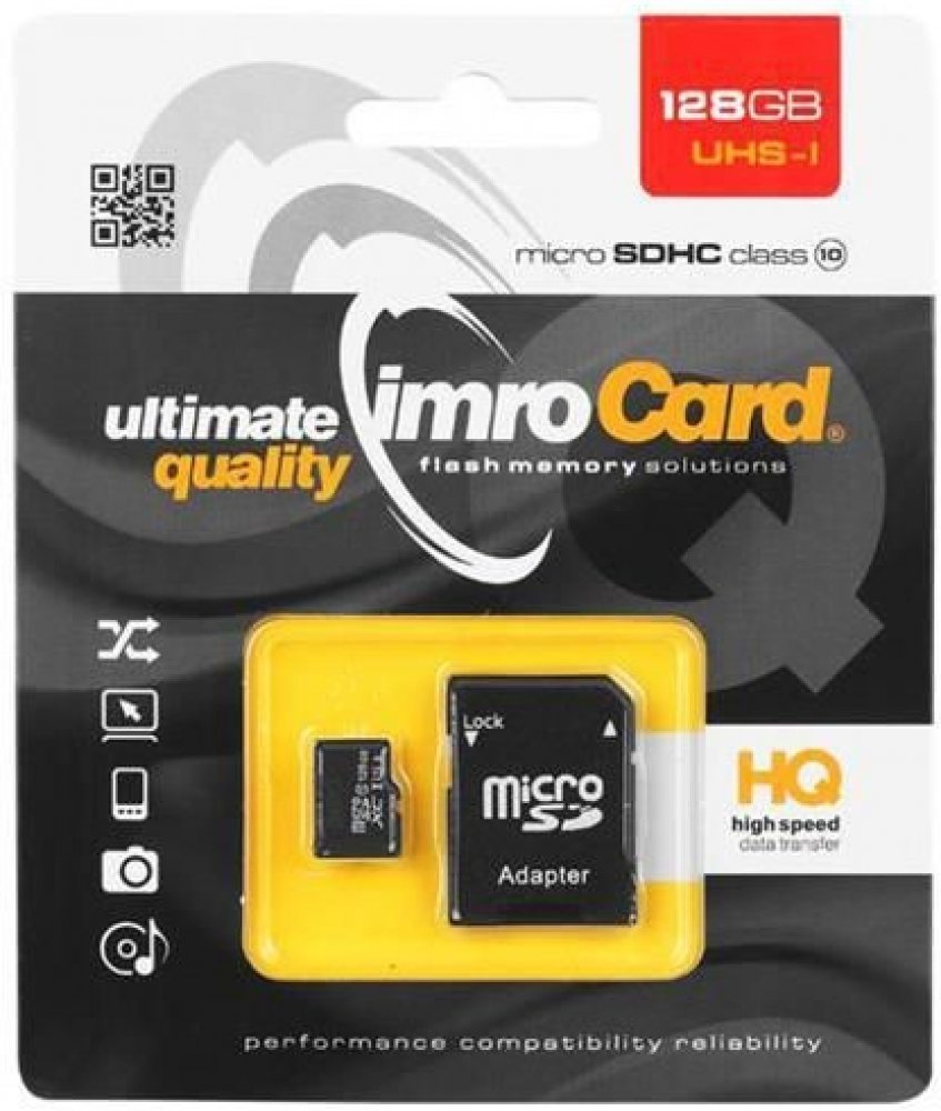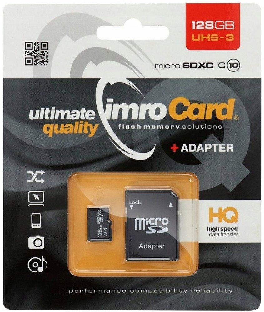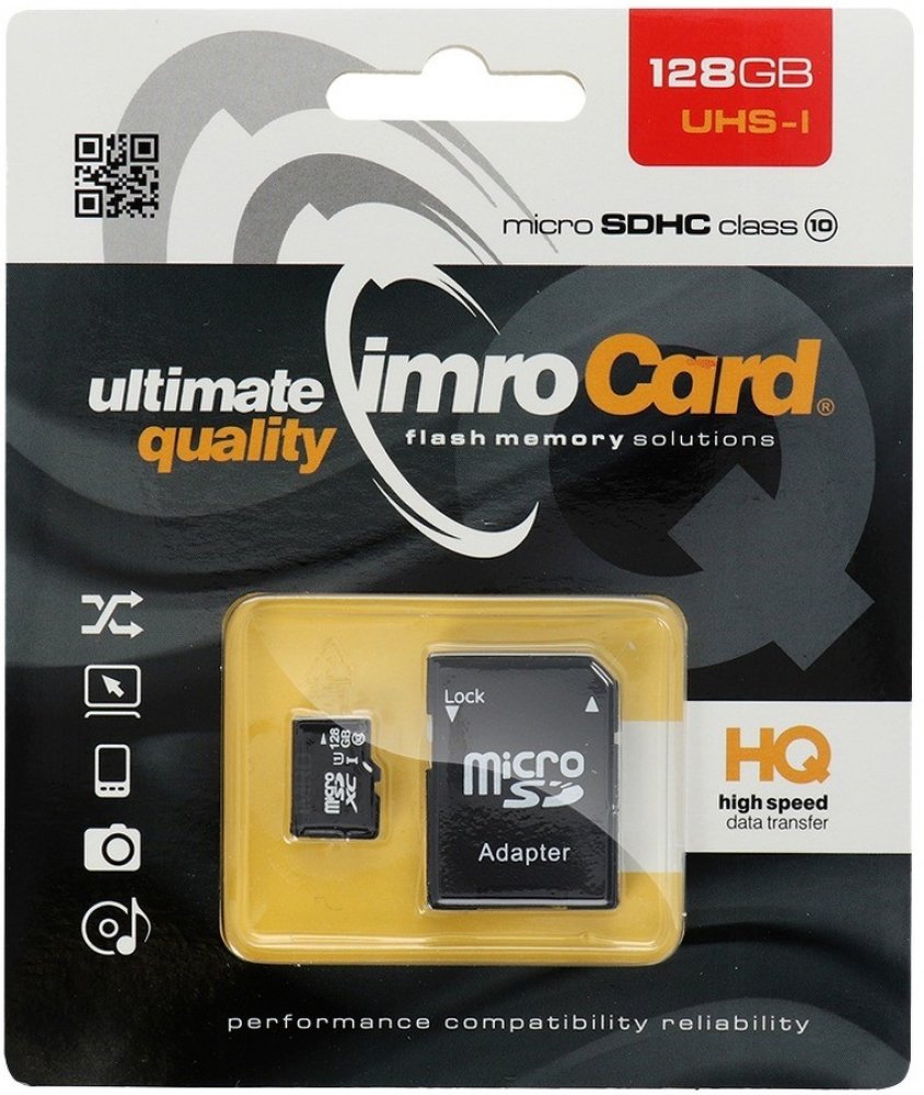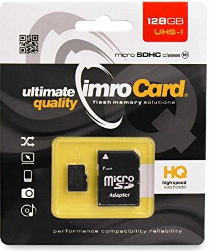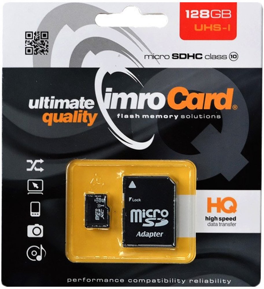 Paměťová karta Imro 128GB micro + adaptér. Doporučuje se zejména pro DVR, kamery s FullHD rozlišením.