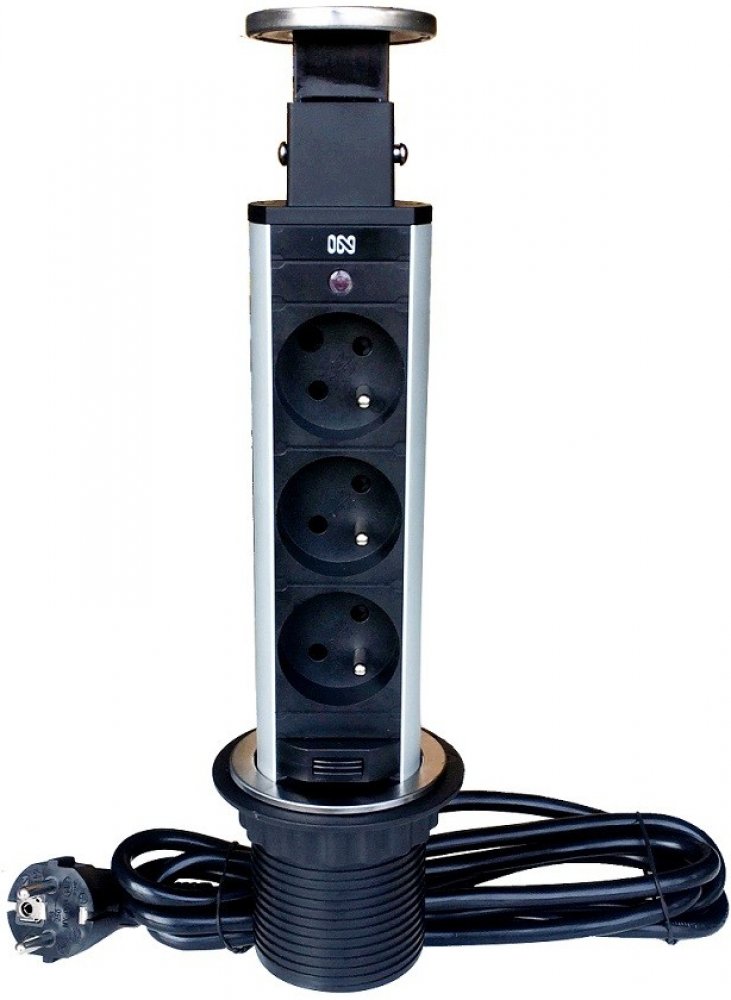Výsuvná zásuvková lišta zahrnuje 3 zásuvky a je určena všude tam, kde je potřeba skrýt kabely a mít pohodlný přístup k elektrickým zásuvkám. Úzká robustní konstrukce vyrobena z odolného plastu a hliníku zaručuje vysokou kvalitu. Lišta se 3 zásuvkami se svisle posouvá až do zacvaknutí bezpečnostní pojistky, která zabraňuje jejímu samovolnému zasunutí. Blok se instaluje do vyvrtaného otvoru o průměru 6 cm například děrovací pilou. Přívodní kabel má optimální délku 2 metry. Výsuvná zásuvková lišta se hodí do kuchyňských, pracovních desek a kancelářských stolů.