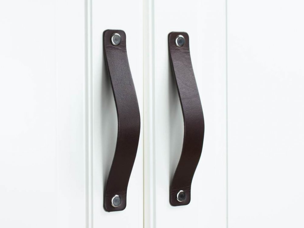 Nábytková kožená úchytka/knopka v tmavě hnědé barvě s hranatým ukončením. Součástí balení jsou okrasné krytky šroubku stříbrné barvě. Navíc úchytku můžete použít také jako knopku.