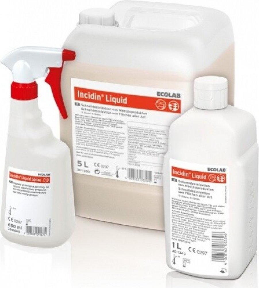 Incidin Liquid tekutý dezinfekční přípravek na bázi alkoholů k přímému použití pro rychlou a bezpečnou dezinfekci předmětů a ploch postřikem. Jedná se o dezinfekční prostředek k přímému použití se ??irokým spektrem účinnosti, snadná manipulace šetří čas zdravotnickému personálu i pacientům, neředí se, působí rychle, zasychá a nezanechává zbytková rezidua, neobsahuje aldehydy! Jeho složení je kompatibilní s materiály z kovu a plastů odolných vůči alkoholuSpektrum účinnosti: baktericidní, fungicidní, virucidní (omezené spektrum virů vč. HBV, HIV) a tuberkulocidní.Obsah účinných látek ve 100 g přípravku: 35 g 2-propanolu, 25 g n-propanolu.Oblast použití: Incidin liquid se uplatní pro plošnou dezinfekci ve všech typech zdravotnických zařízení, je ideální pro stomatologické ambulance, penziony seniorů, v práci pečovatelské služby, v provozu sanitek a při přepravě pacientů vůbec. Doporučujeme jej i pro práci v laboratořích, ve farmaceutické a kosmetické výrobě, v provozovnách kosmetiky, ho