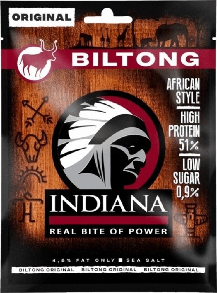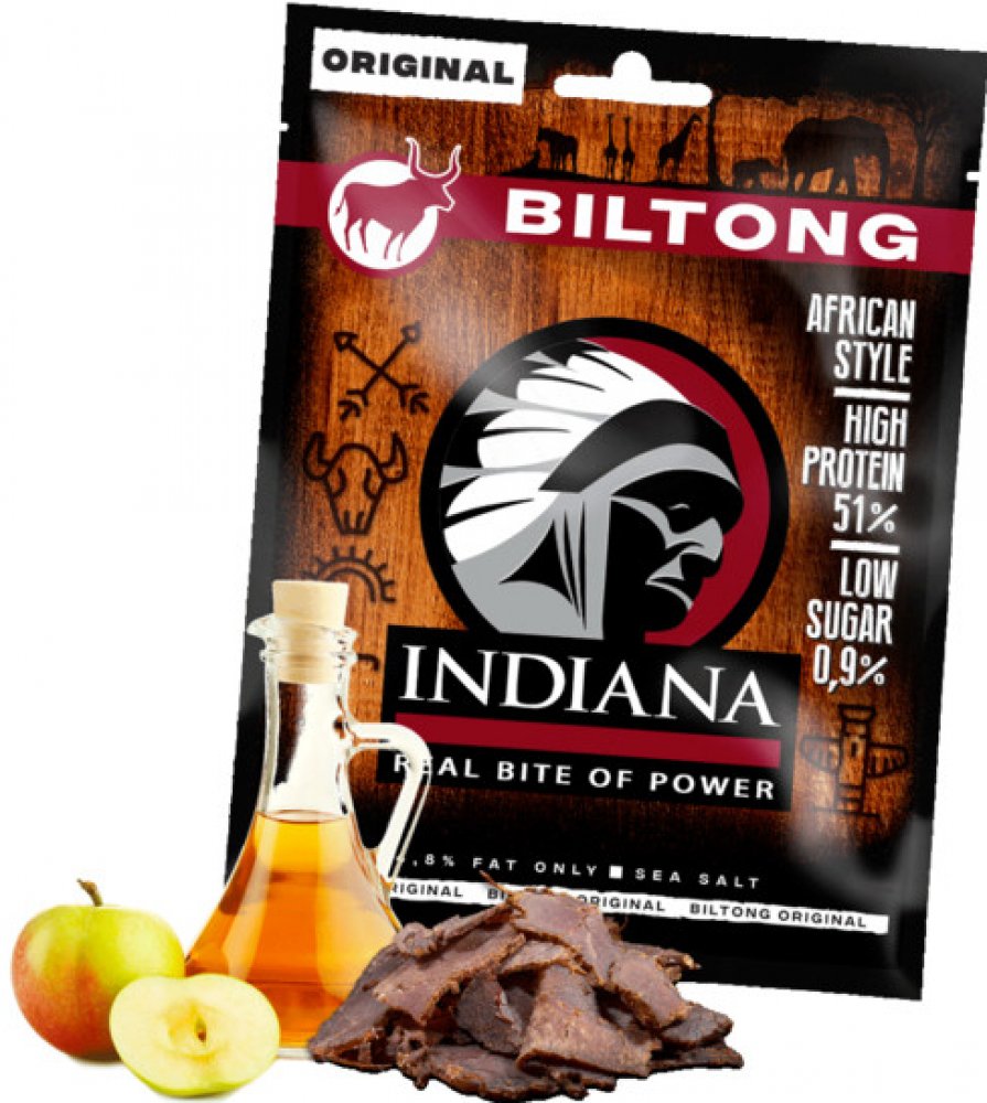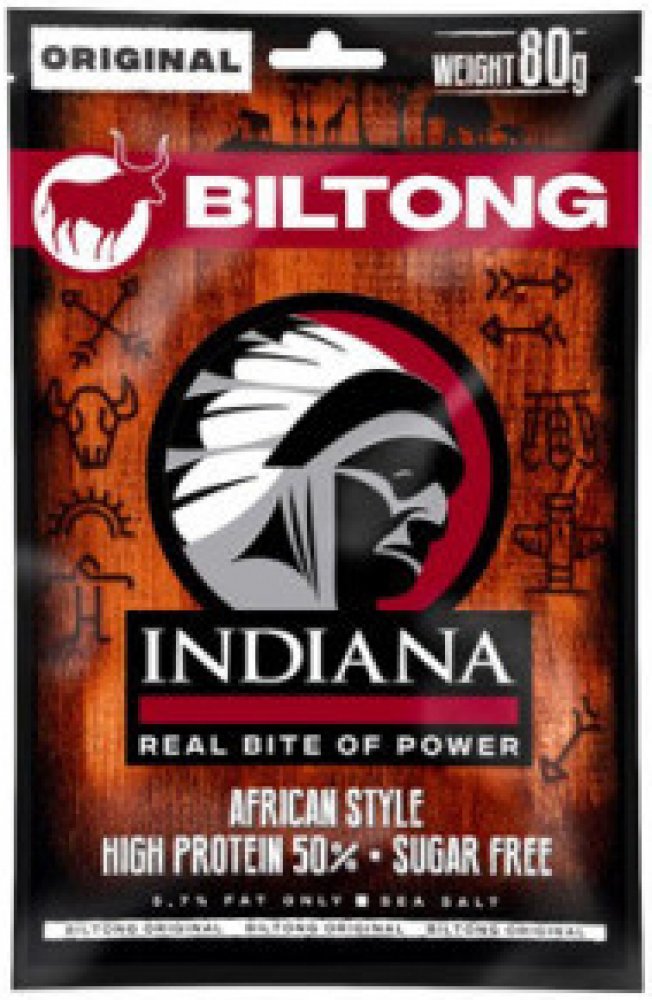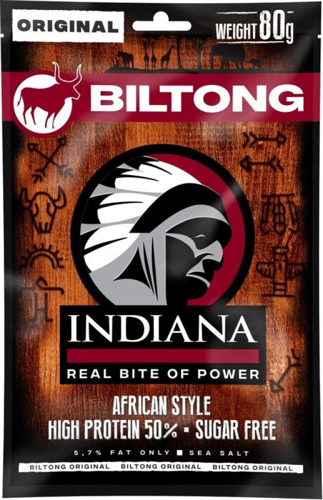 Hovězí maso marinované v koření, následně usušené a nakrájené na tenké plátky. Svačinka plná bílkovin vycházející z receptur z Jižní Afriky. Neztratí se na cestách, doma ani v kanceláři. 100 g Indiana Biltong je vyrobeno z 220 g hovězího masa.