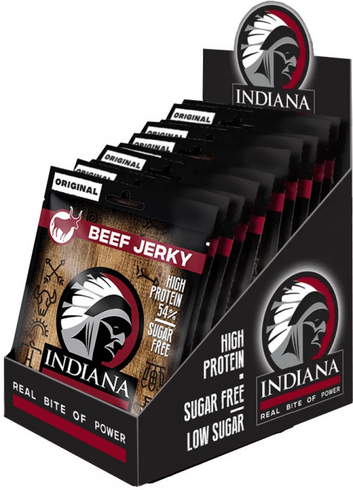 Jste připraveni na šťavnaté hovězí? Tohle je nejoblíbenější jerky bledých tváří – náčelníkova originální receptura s nezaměnitelnou evropskou slanou chutí masa. Stačí otevřít sáček a zakousnout se! Indiana Jerky vám dodá pořádný kus energie při zachování minimální hmotnosti.