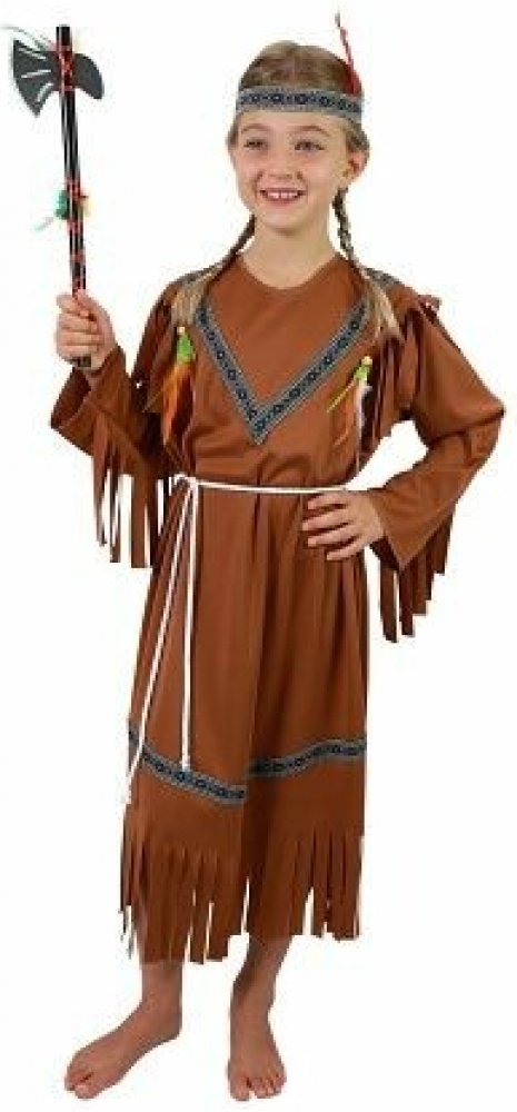 Stylový karnevalový kostým v motivu indiánské slečny! Kostým hnědé barvy ve velikosti M je určen pro děvčata ve věkovém rozmezí 6-8 let (116-128 cm). Balení obsahuje šaty s indiánskými vzory, šňůrku sloužící jako opasek a perfektně sladěnou čelenku. Celé šaty jsou navíc zdobeny střapci.