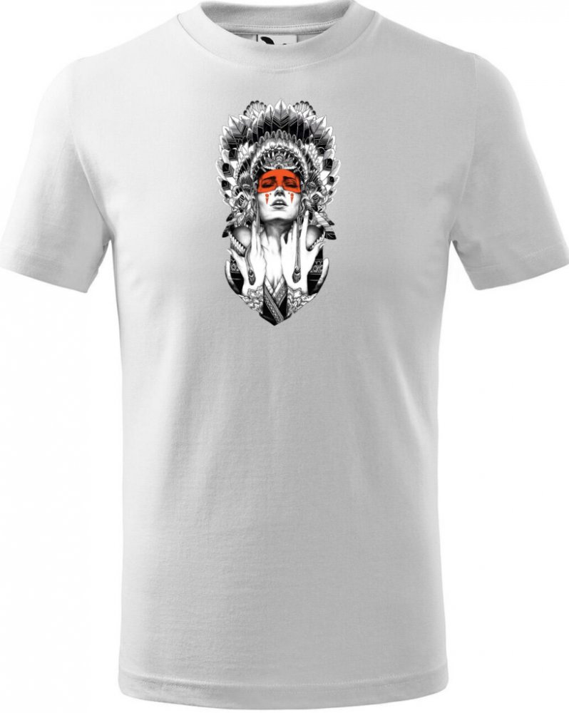 Indiánka Toto tričko je víc než jen oděv, je to umělecké dílo s duší. Detailní portrét zachycuje tvář ženy s pohledem upřeným vzhůru, ozdobenou majestátní a složitě propracovanou indiánskou čelenkou. Černobílé provedení zdůrazňuje každý detail peří a ornamentů, zatímco výrazný červený pruh barvy přes oči dodává motivu moderní nádech a symbolickou sílu. Je to pocta síle, duchovnosti a spojení s pří...