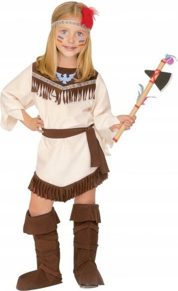 Šaty jsou zdobeny hnědými třásněmi, na přední straně je indiánský lem a znak orla. Kostým béžovo-hnědý je vyroben z polyesteru.