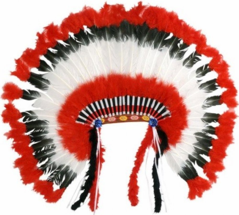 Indiánská červeno-černo-bílá čelenka s výšivkou. Čelenka je velká cca 30cm po natažení až cca 40 cm. Délka per je cca33cm. dělka postraních dekorace je cca 25 cm. Vhodná na indiánské tábory nebo podobné akce. Pro děti nebo i dospělí s menší hlavou.