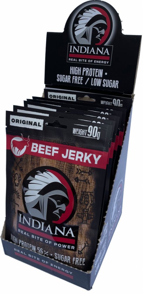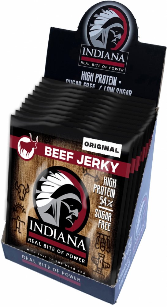 Jste připraveni na šťavnaté hovězí? Tohle je nejoblíbenější jerky bledých tváří – náčelníkova originální receptura s nezaměnitelnou evropskou slanou chutí masa. Stačí otevřít sáček a zakousnout se! Indiana Jerky Vám dodá pořádný kus energie při zachování minimální hmotnosti.